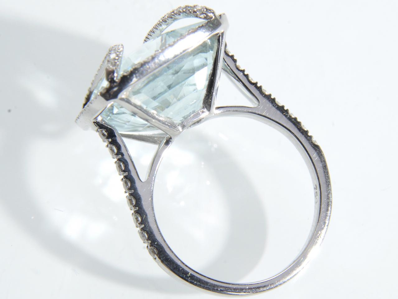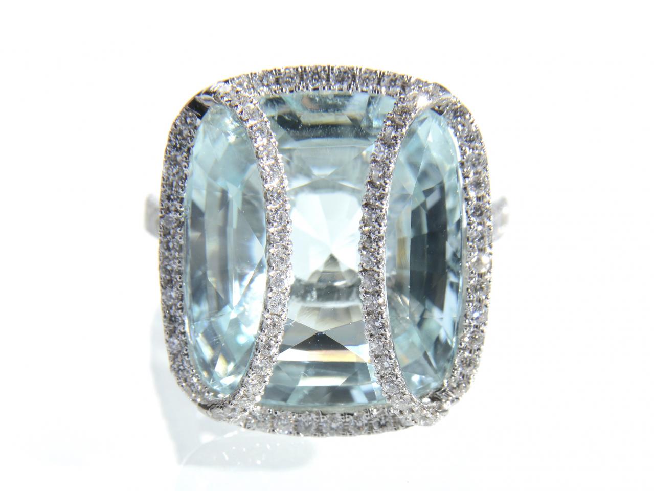 Modern aquamarine and diamond cocktail ring in 18kt white gold, set with a cushion shape fancy cut aquamarine in a grain setting, surrounded and flanked by round brilliant cut diamonds in pave settings, to a large cocktail ring with two curved diamond set panels sweeping over the centre of the stone, flanked by raised diamond set shoulders which terminate to a solid shank. Estimated total diamond weight 1.00cts.
