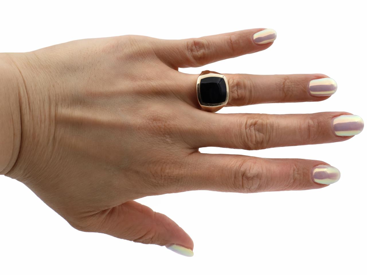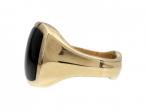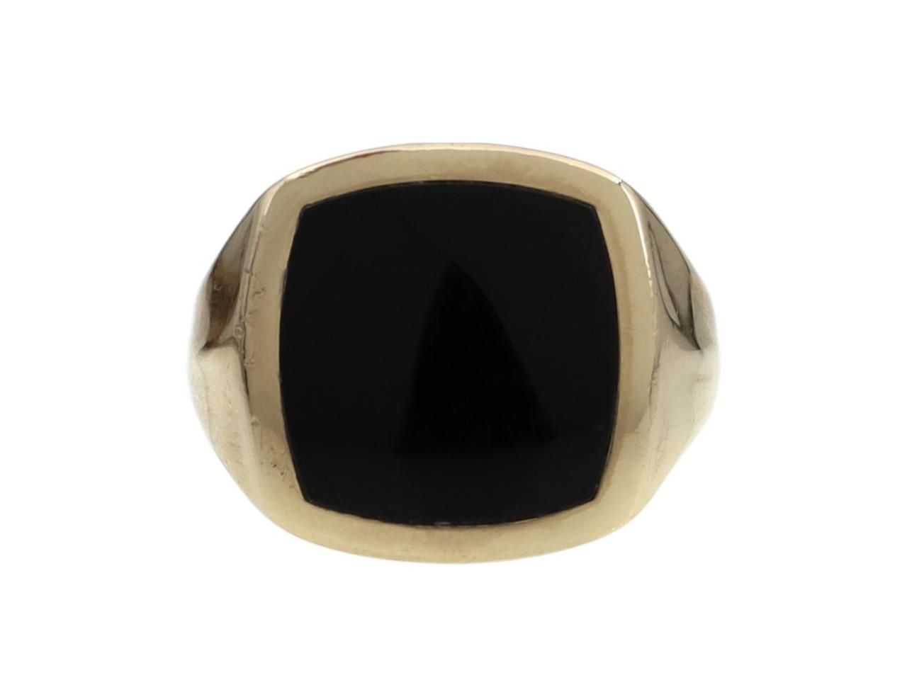 Modern cushion shape onyx signet ring in 14kt yellow gold. Centred with a cushion shape tablet of black onyx in an invisible setting, to a heavy signet ring with polished borders and gallery, flanked by broad trumpeting shoulders featuring a subtle chamfered centre which tapers and smooths to the reverse where the shank broadens to a peak. Marked 14kt gold. Signed 'BMMB'.