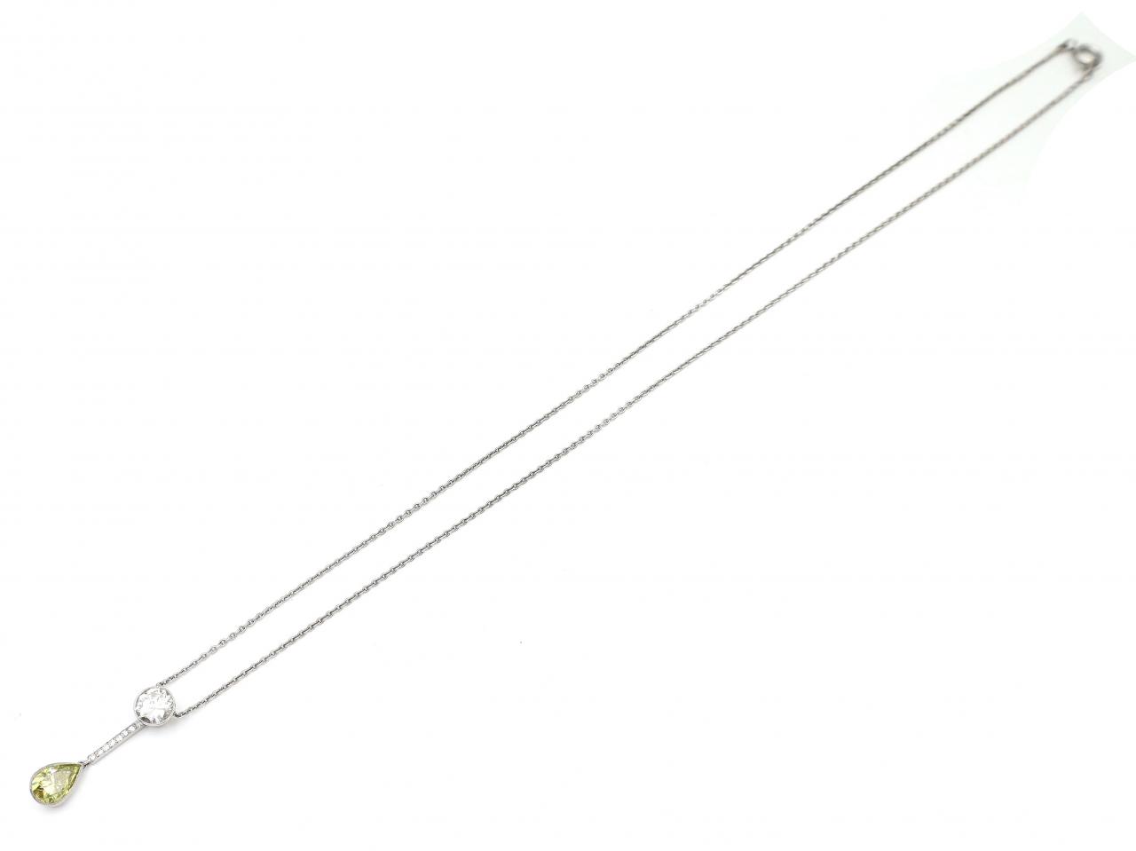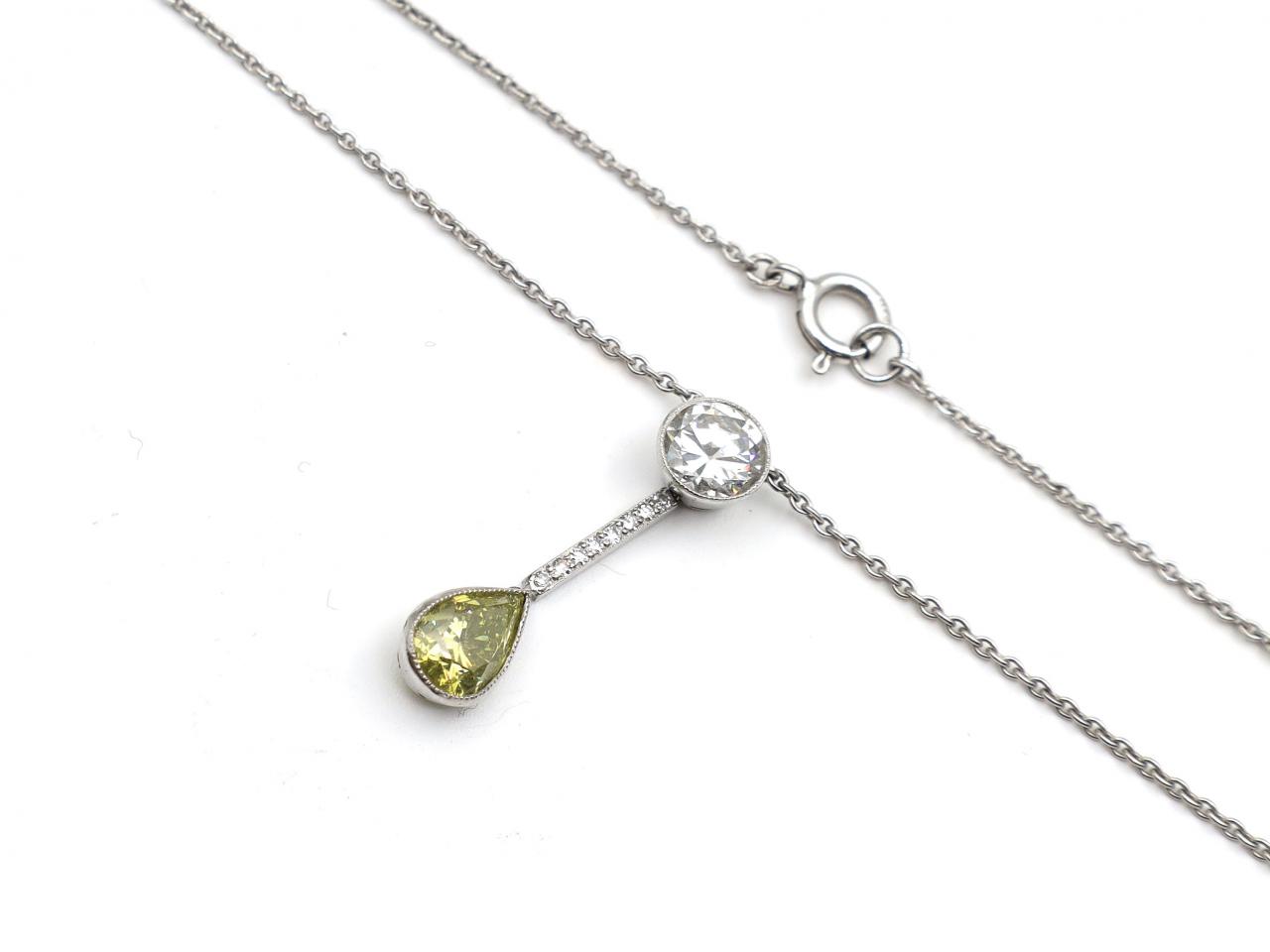 Modern treated green diamond necklace in platinum. A platinum trace chain centred with a round brilliant cut diamond in a millegrain collet, suspending a linear diamond set pendant terminating to a 0.65ct pear brilliant cut treated green diamond in a millegrain collet.