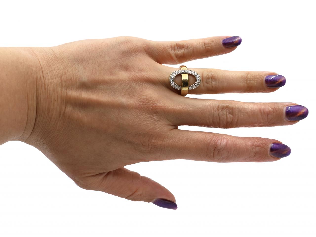 Modernist diamond open oval ring in 18kt yellow gold. An open oval set with twenty round brilliant cut diamonds in grain settings, centred and flanked by a continuous polished yellow gold shank. Marked 18kt gold.