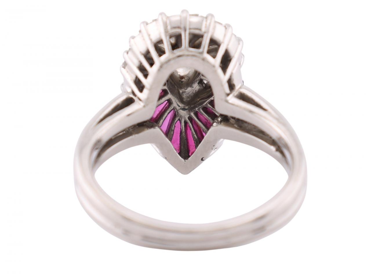From the legendary American jeweller Oscar Heyman comes this exceptional ballerina ring in platinum and iridium. The design centres on a 1ct pear cut diamond of E/F colour, surrounded by a fan of calibré cut baguettes that split the composition in two. The upper half radiates with tapered baguette diamonds, while the lower half blooms with calibré cut rubies in a rich, saturated pink-red. It's a study in contrast and symmetry, with the colour transition creating visual drama that makes this ring impossible to ignore. The construction is unmistakably Heyman: precise stone matching, invisible-style setting on the calibré cuts and that characteristic openwork gallery visible from the side. This is not jewellery for the timid. At 10.39 grams of platinum and iridium, it has the heft and presence of something made to be worn by someone who means it.