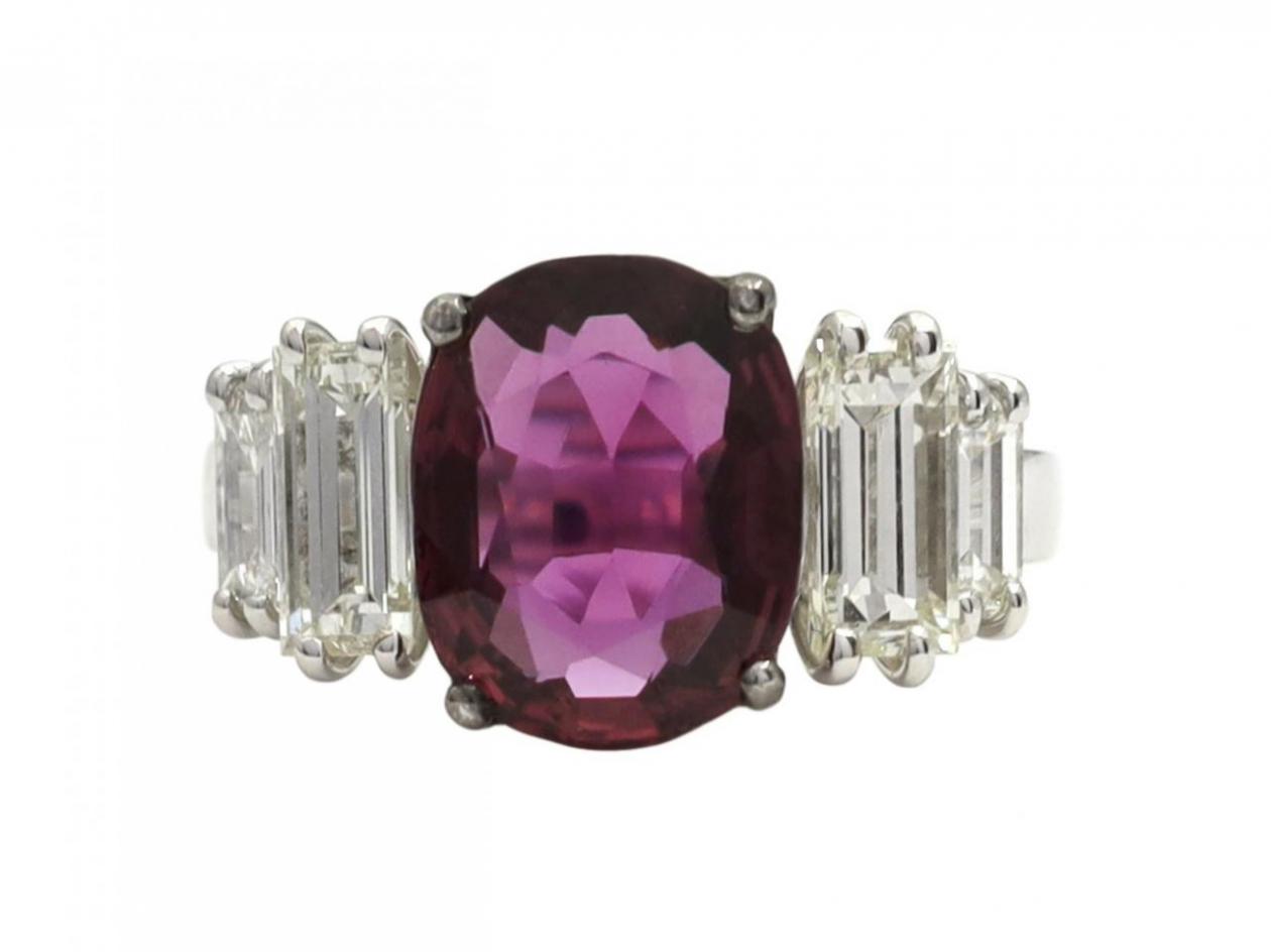Oval cut ruby and diamond ring in white gold. Centrally set with an estimated 2.80ct oval brilliant cut ruby in a four claw setting with an open collet, flanked on either side by four graduated diamond rectangular baguettes in curving claws with an open gallery terminating to a solid shank. Estimated 2.06ct of diamonds. Tested 18kt gold.
