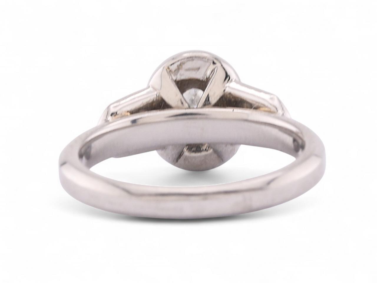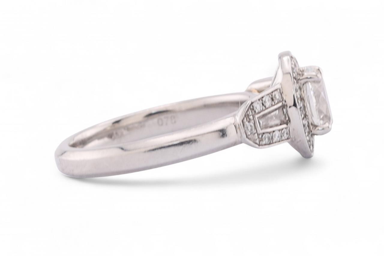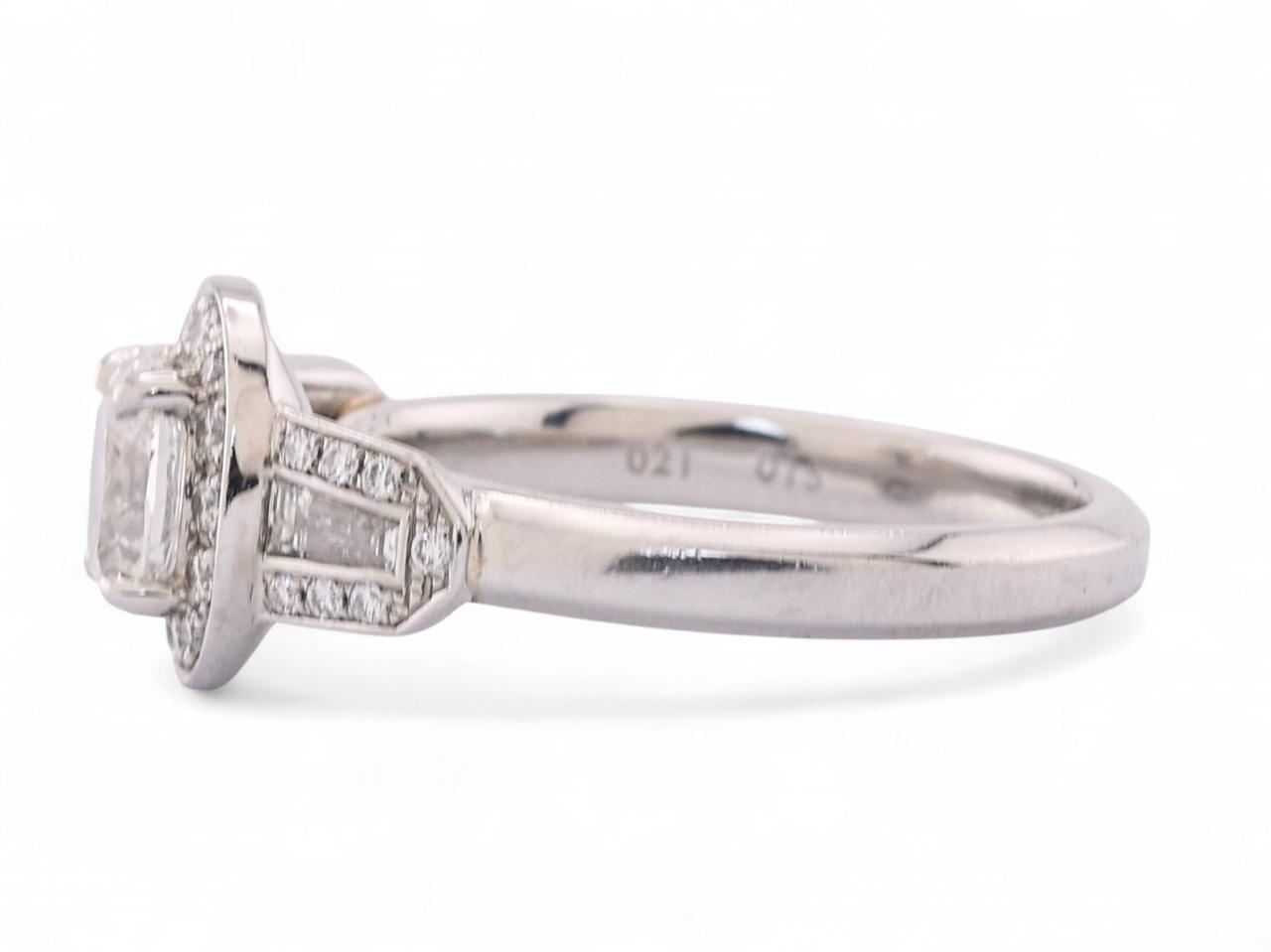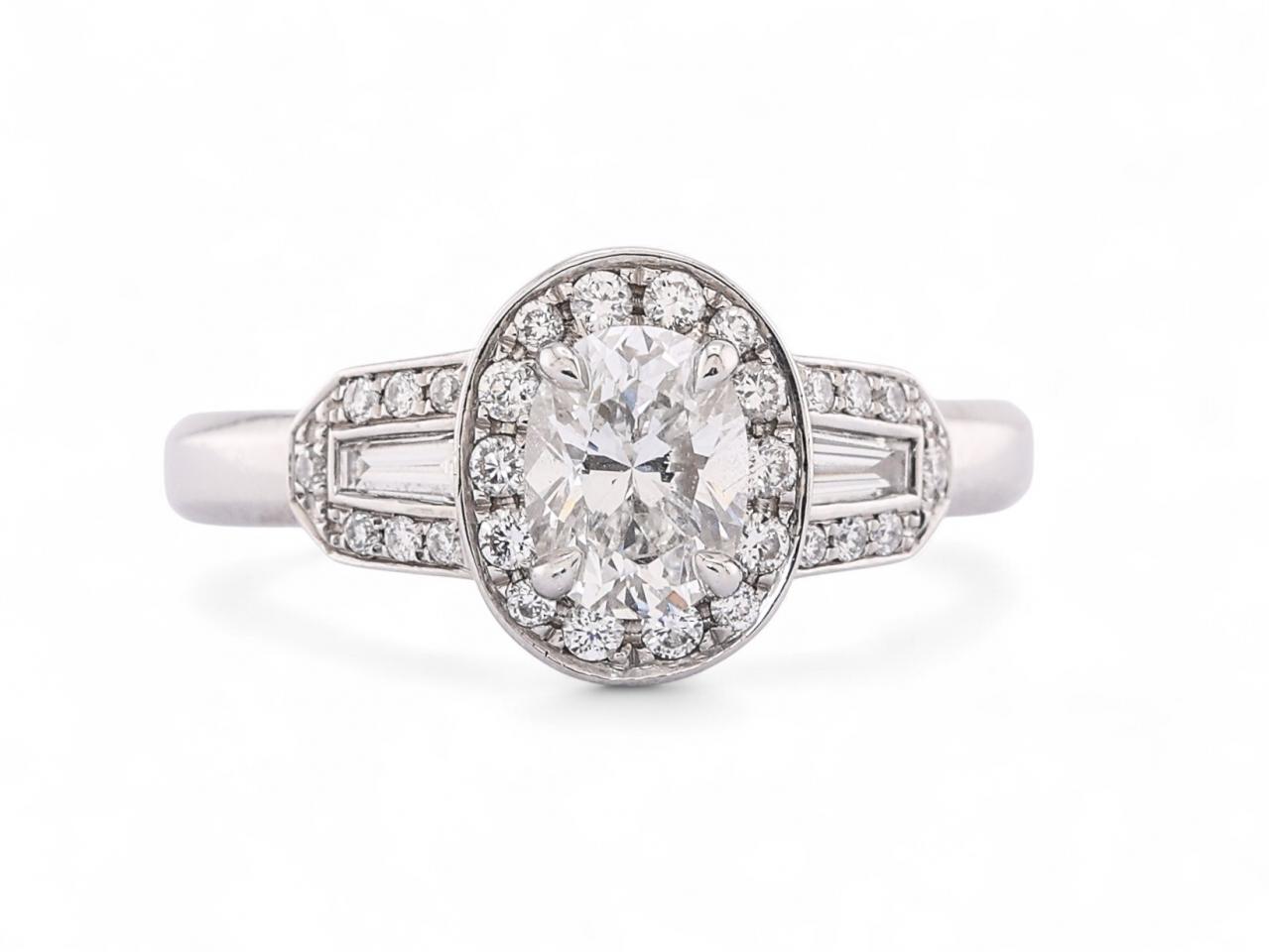 A contemporary diamond ring in 18ct white gold featuring a brilliant-cut diamond to the centre, weighing approximately 0.78ct, of F/G colour and VS2 clarity. The centre stone is surrounded by a halo of smaller round brilliant-cut diamonds with tapered baguette-cut diamond shoulders, total additional diamond weight approx. 0.50ct. The ring combines elegant Art Deco inspiration with modern craftsmanship. Currently size M.