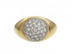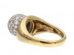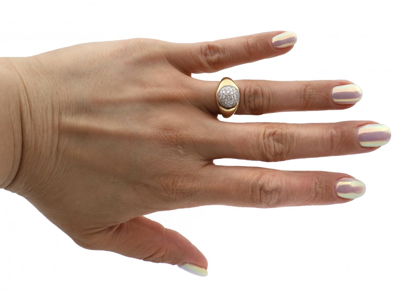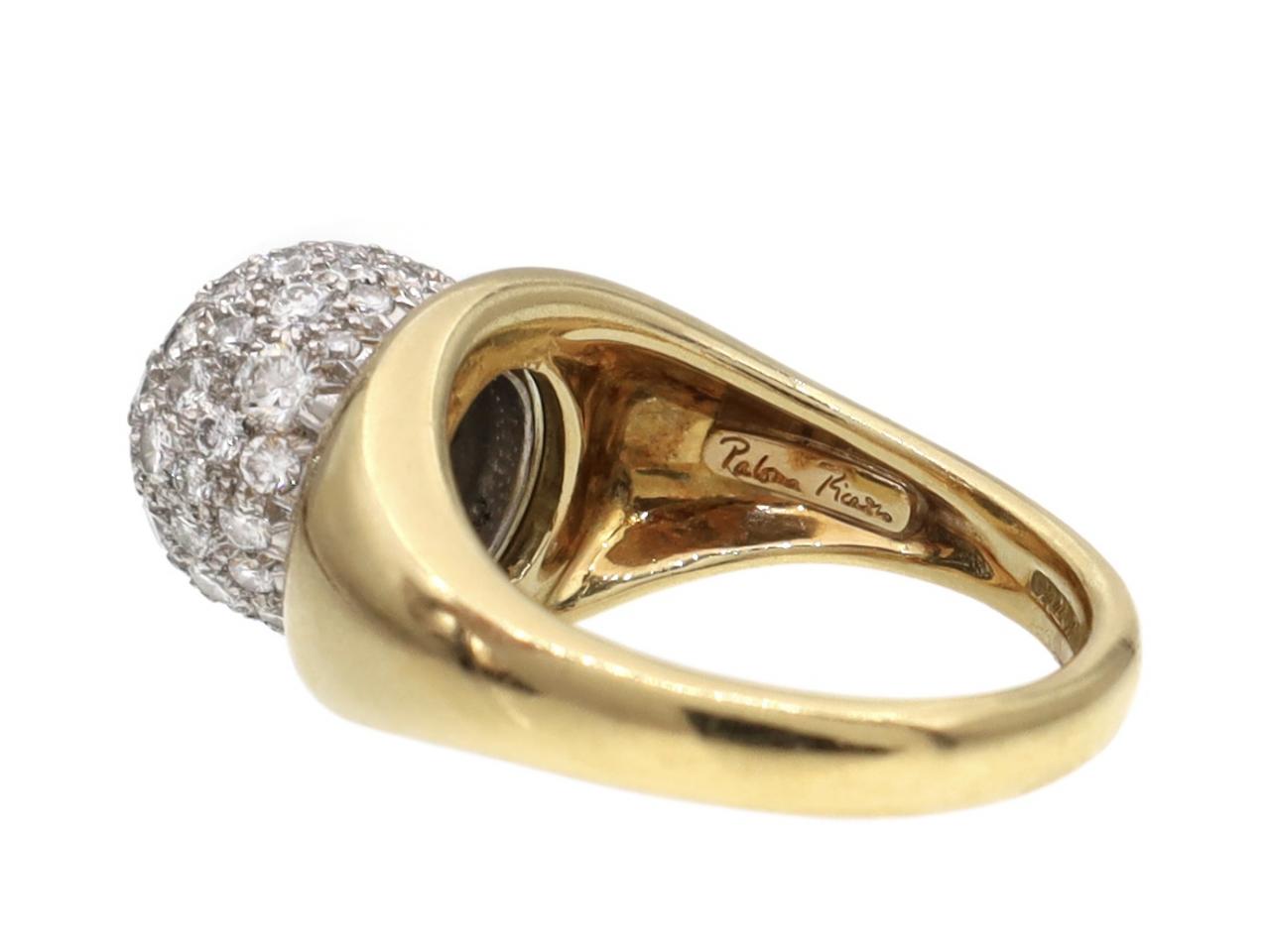 Paloma Picasso for Tiffany & Co. circular diamond bombe cluster ring in platinum and 18kt yellow gold. Centred with a circular domed cluster of round brilliant cut diamonds in pave platinum settings, to a three-dimensional centre encompassed by a buttery yellow gold surround with a warm patina with integrated shoulders which gently taper to a solid shank. Marked platinum and 18kt gold. Signed 'TIFFANY & Co. PALOMA PICASSO', circa 1980.