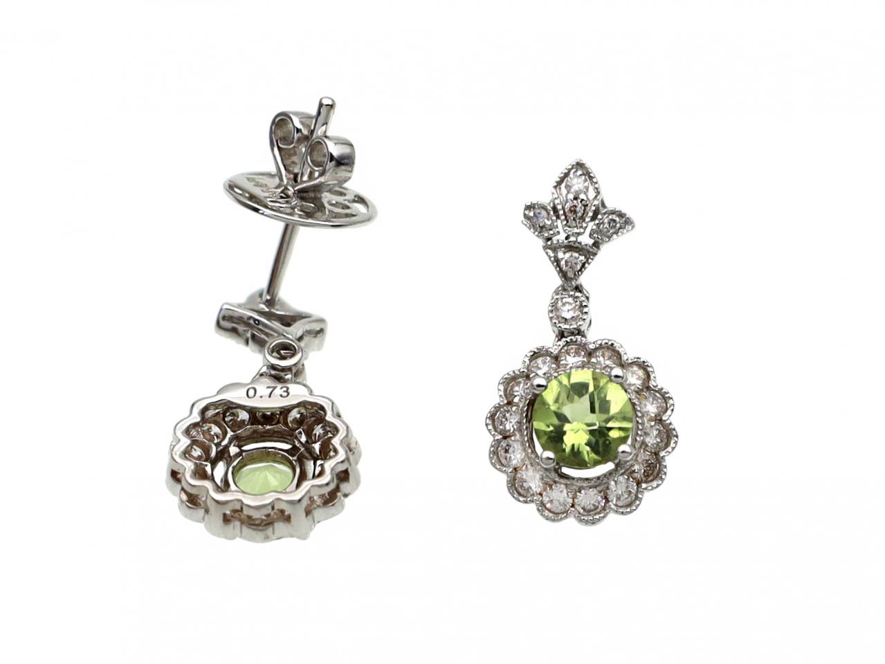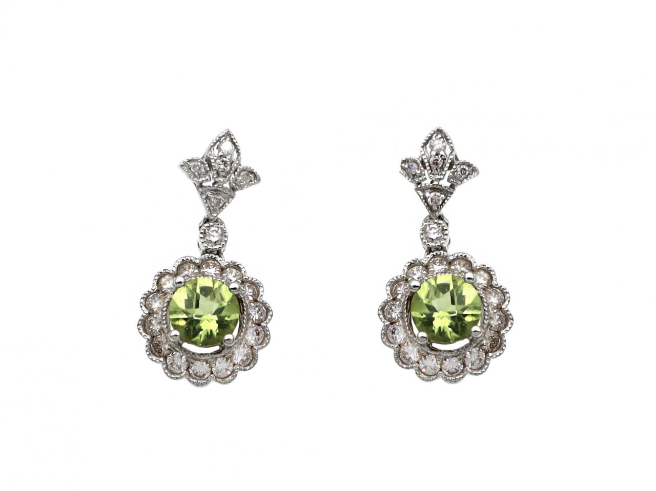 Peridot and diamond floral drop earrings in 18kt white gold. A matching pair of earrings, each set with a round mixed cut peridot in a claw setting, surrounded by diamond set petals, suspended by a diamond set fleur de lis, decorated throughout with millegrain borders and fitted to the reverse with a secure post and butterfly.