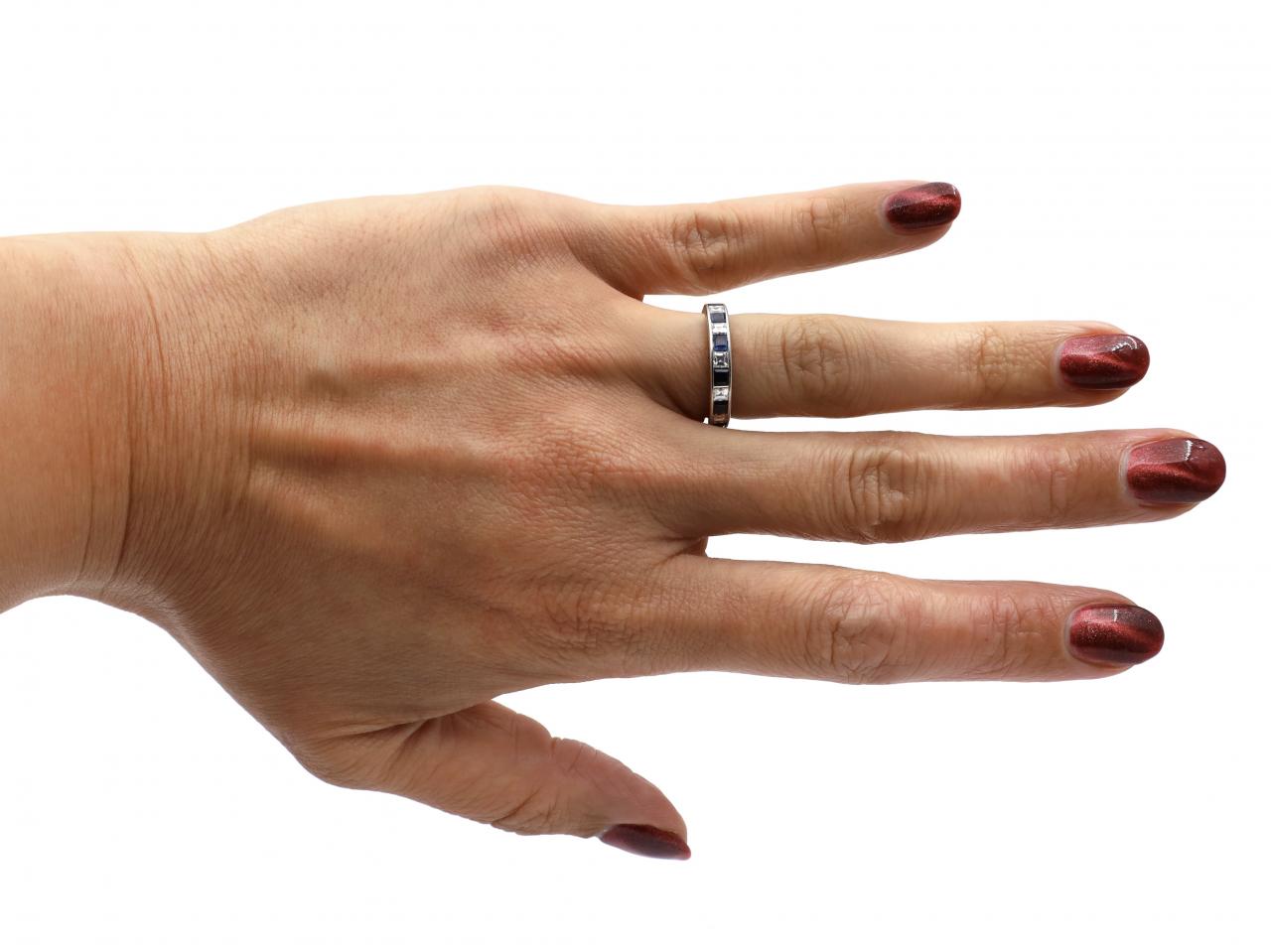 Platinum diamond and sapphire full eternity ring. Set around the full circumference with alternating square Asscher cut diamonds and square step cut sapphires in channel settings with polished borders. Hallmarked platinum.