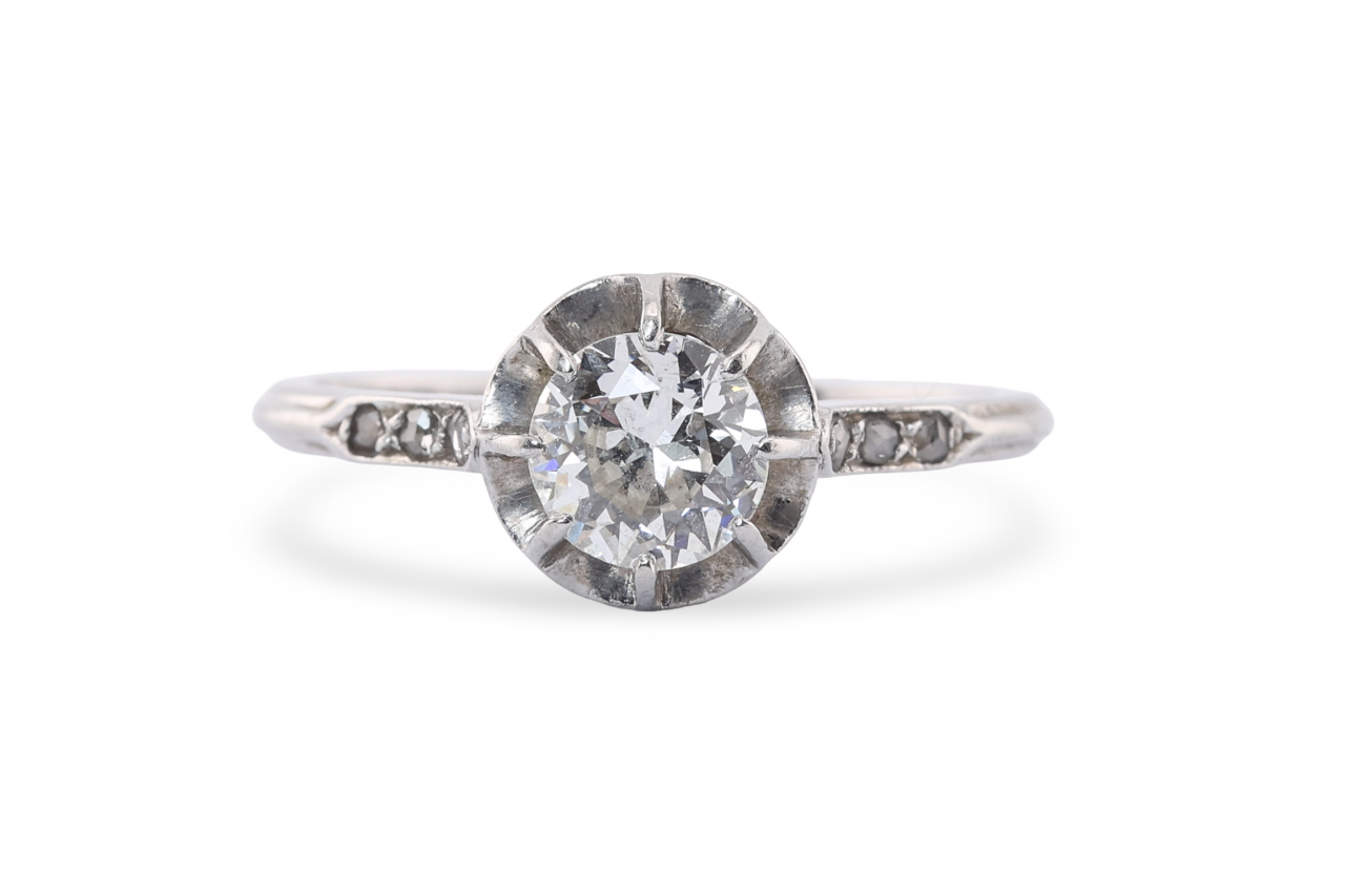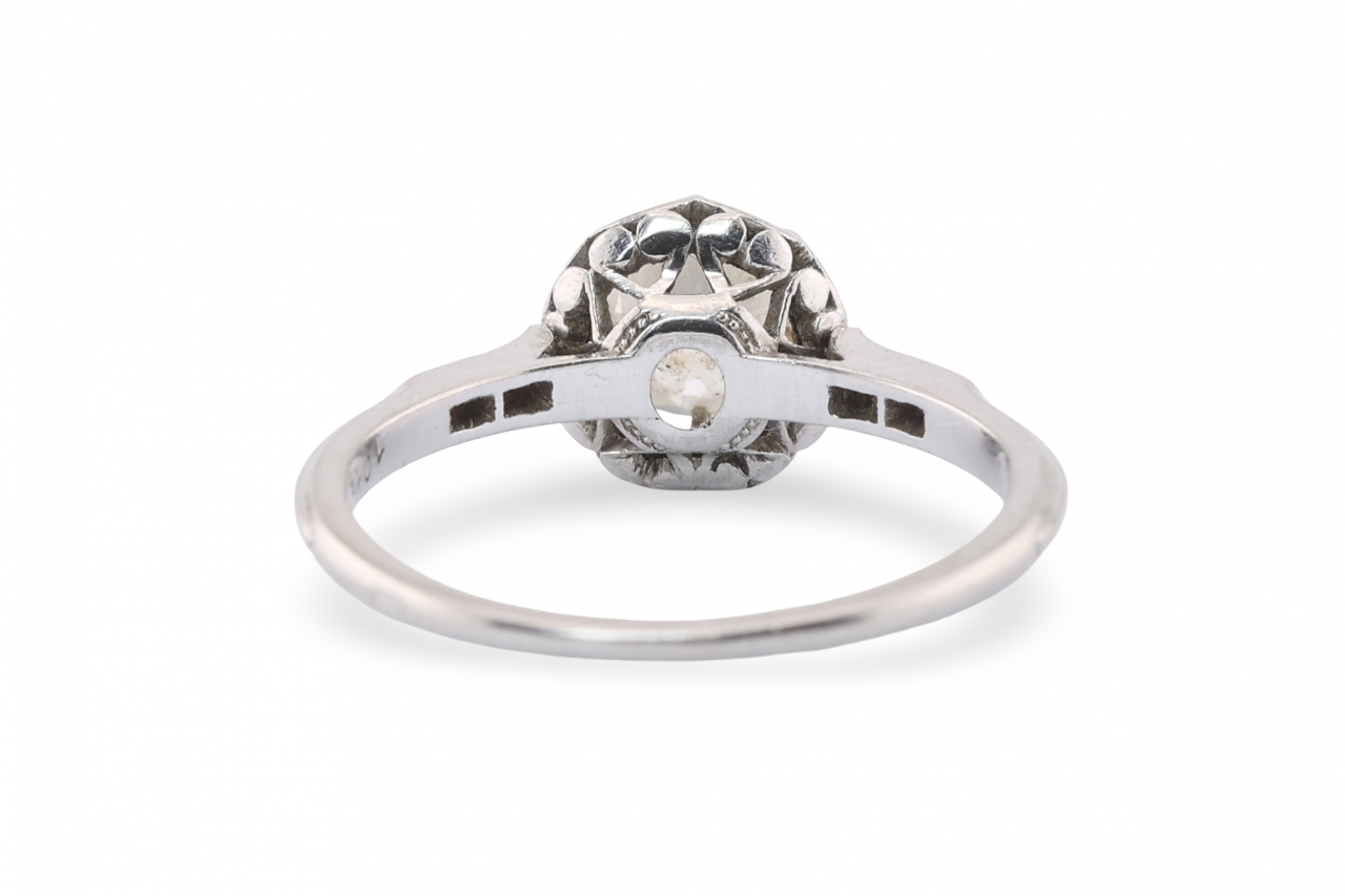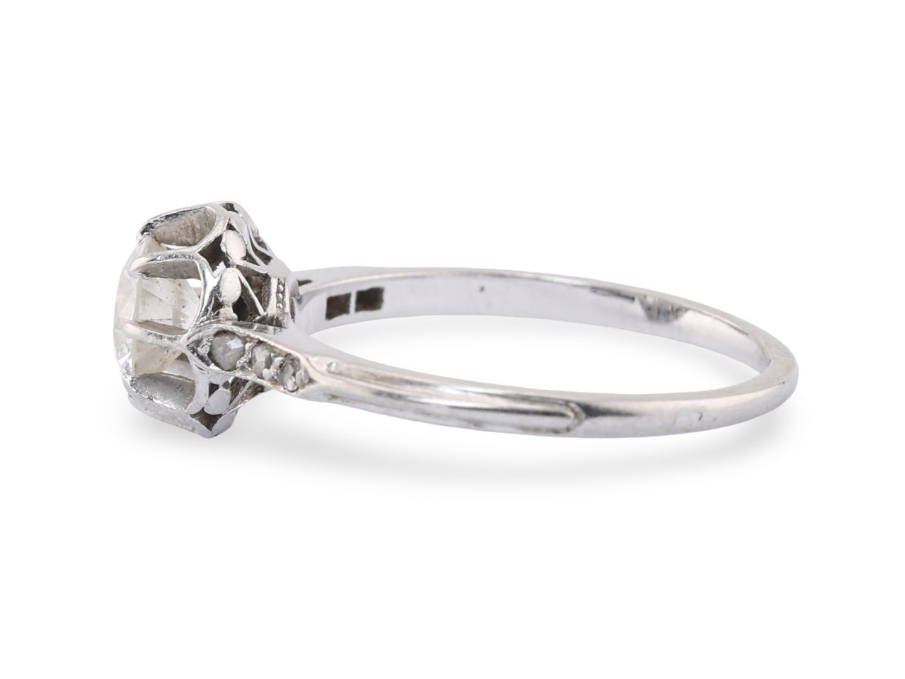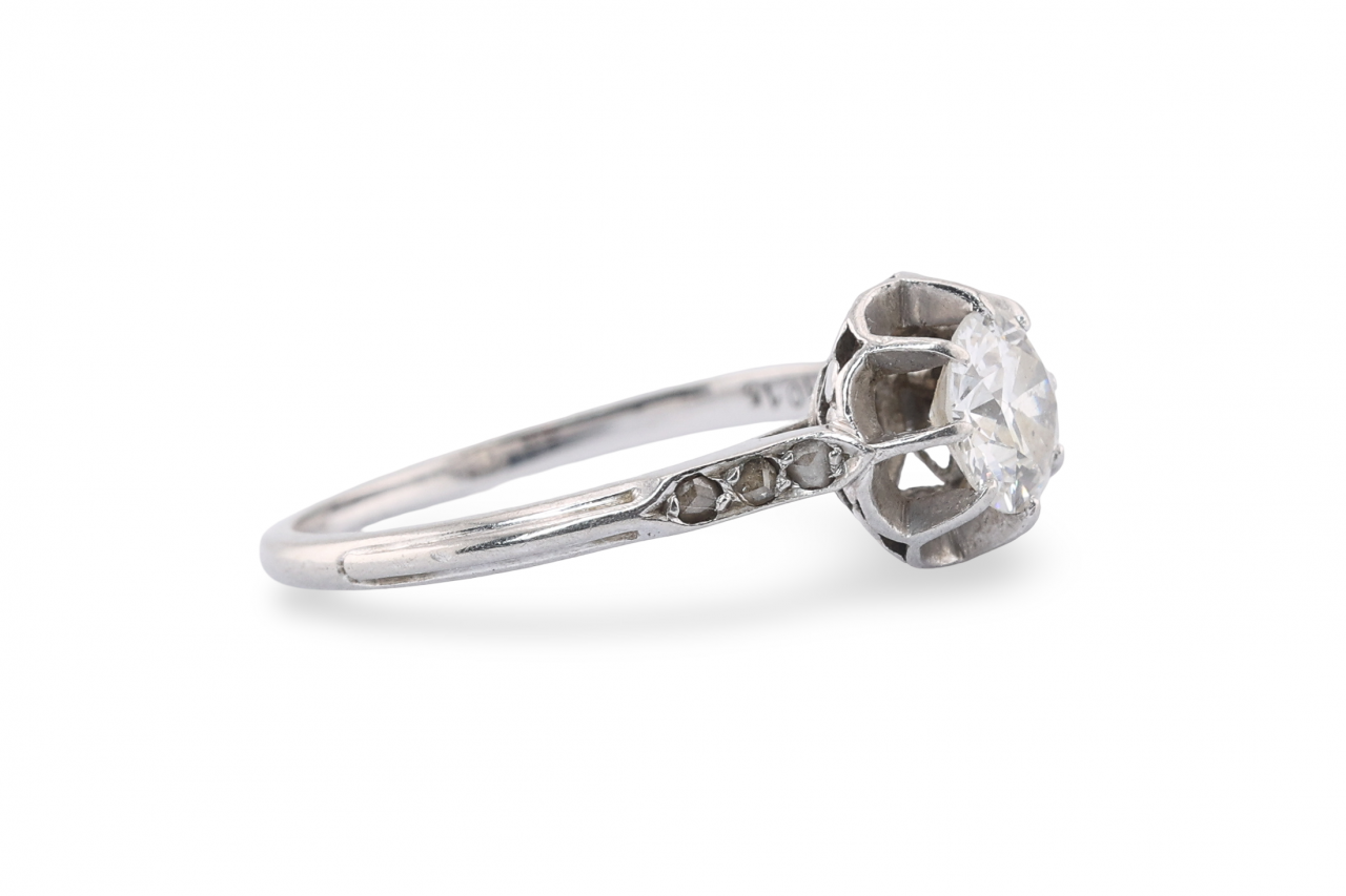 Small rose-cut diamonds are set into each shoulder, adding subtle detail to the tapering platinum shank. The combination of the high coronet setting with rose-cut shoulder stones is characteristic of French workshop production from the Art Deco period, and the construction and wear here look consistent with that dating.