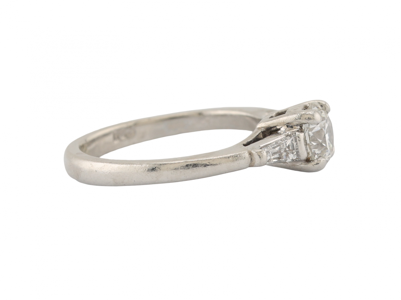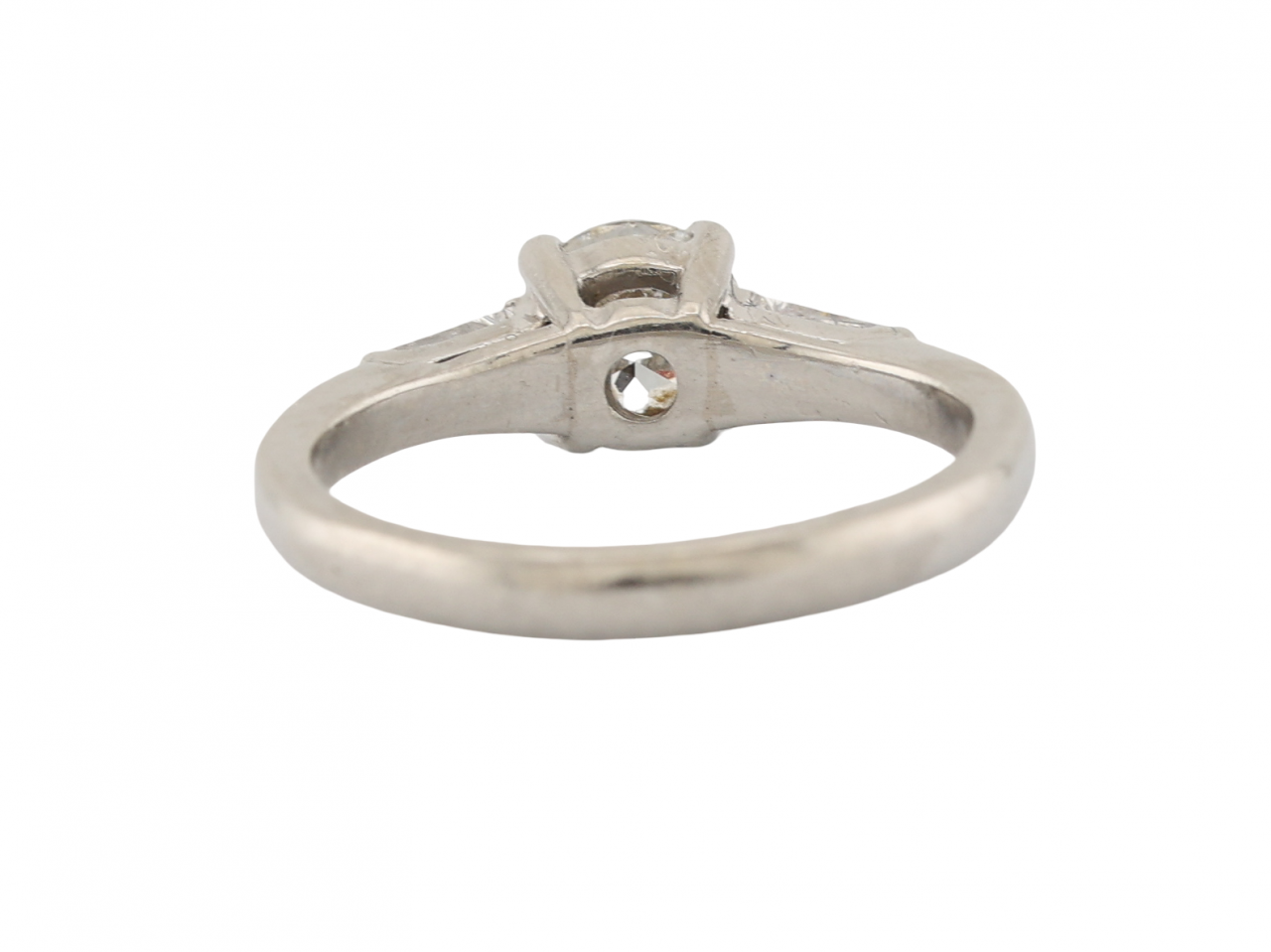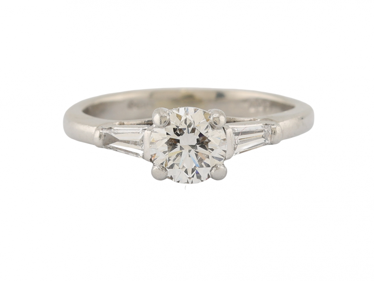Flanking the centre diamond are two tapered baguette cut diamonds, channel set into the shoulders. These elongated stones create a sleek, elegant transition from the solitaire head to the plain platinum shank. The tapered baguette and round brilliant combination is a timeless design that has remained popular for good reason: it adds visual interest without competing with the centre stone.