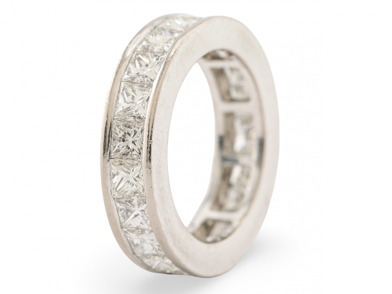 A platinum full eternity ring channel set with princess cut diamonds totalling an estimated 7.5 carats. The diamonds run continuously around the entire band, each stone sitting flush within the channel with no gaps or metal dividers between them. This creates an unbroken line of brilliance that catches the light from every angle.