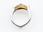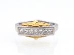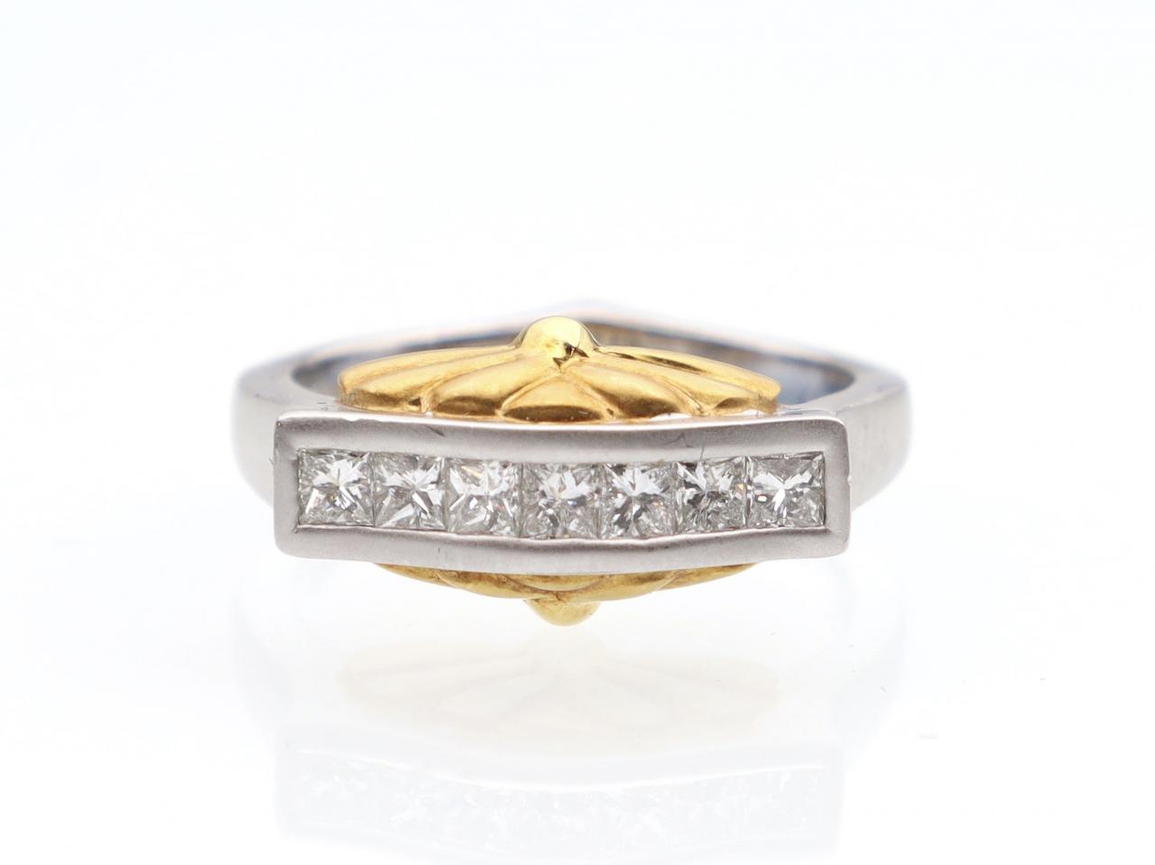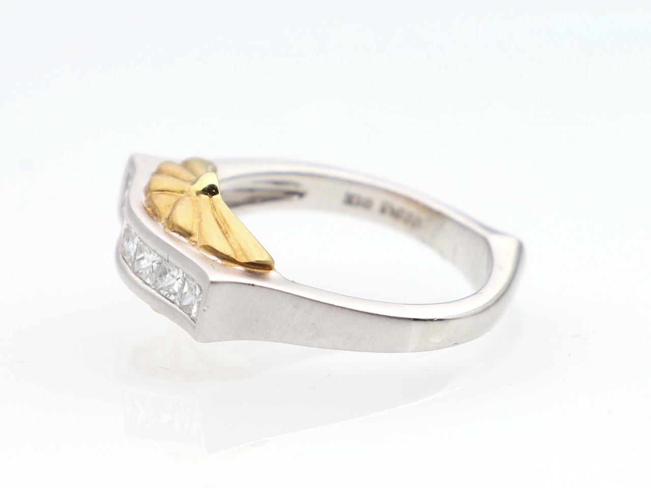 Princess cut diamond band ring with frosted channel settings. Set with seven square princess cut diamonds in channel settings, framed to top and bottom with 18kt yellow gold frosted tent tops, to an undulating half eternity design with sweeping shoulders which flow to a willow peak shank. Estimated total diamond weight 0.70cts. Marked platinum and 18kt gold.