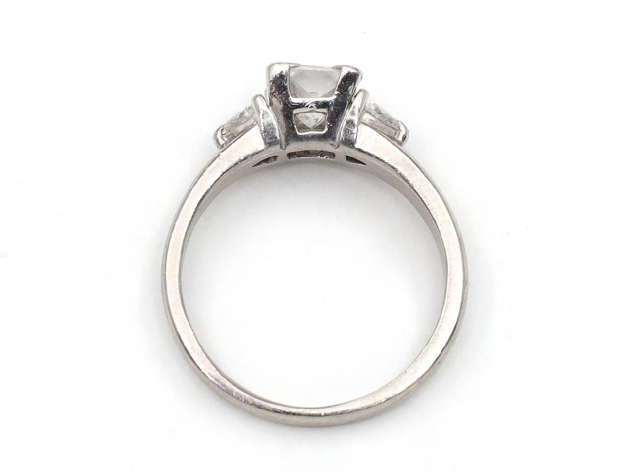 Princess cut diamond solitaire engagement ring in platinum. Centred with an estimated 0.80ct square princess cut diamond in a claw setting, flanked to either side with two triangular trillion cut diamonds in claw settings, to a stylish flanked solitaire design with bespoke claws, structural gallery and met to either side with slightly trumpeting shoulders which smooth to a solid shank. Marked platinum.