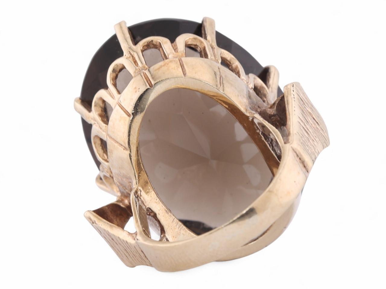 Large dress ring claw-set with a faceted rectangular-cut brown quartz estimated at 47.27 carats. Ring size L.
