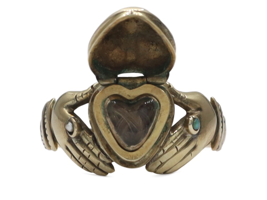 Rare antique Fenian Claddagh, locket ring in 9kt yellow gold. Centred with a puffy heart motif, featuring a hinge to the top opening to reveal a locket enclosed with braided hair, met to either side with finely crafted hands, each pointer finger is depicted wearing a ring, one set with a seed pearl, the other set with a turquoise, terminating to decorative three tiered cuffs which smooth to a solid shank. Tested 9kt gold.