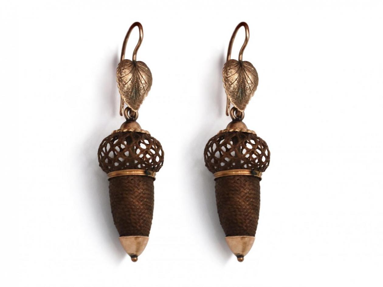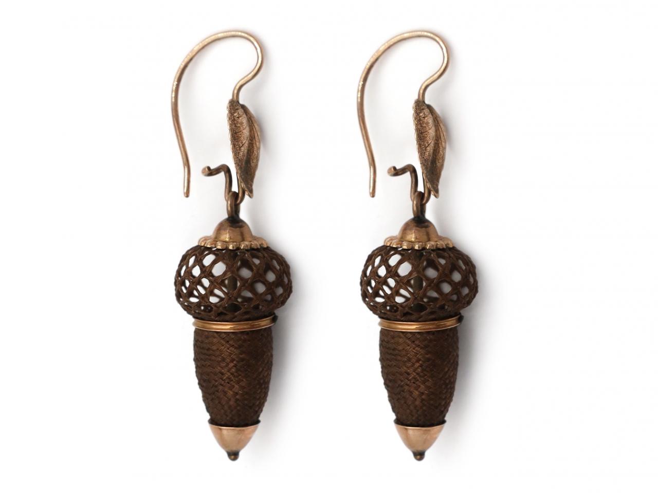 Rare Victorian acorn earrings with woven hair and rose gold.