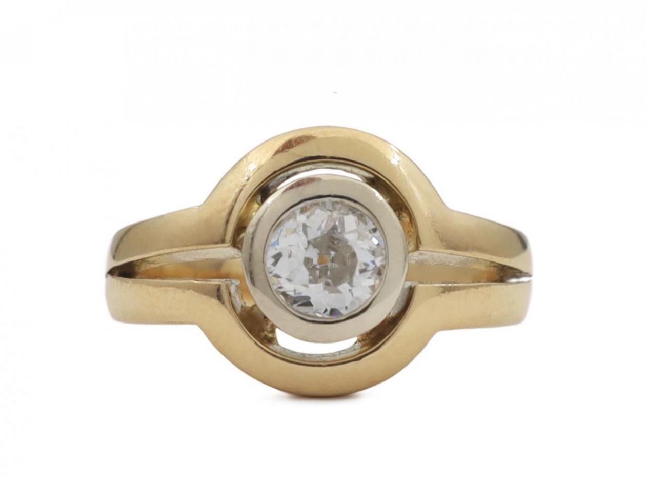 Retro 0.65ct diamond floating solitaire engagement ring in 18kt yellow gold. Centrally set with an estimated 0.65ct round Old European cut diamond in a rubover setting, to a modernist solitaire design featuring a floating polished collet, framed by an openwork border which continues to trumpeting spilt shoulders which terminated to a solid shank.