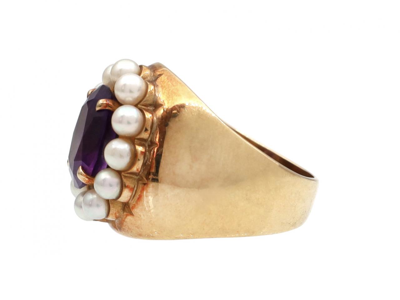 Retro 14kt yellow gold amethyst and seed pearl dress ring. Centrally set with an oval mixed cut amethyst in a slightly raised four claw setting, encircled by a row of seed pearls, to an oval cluster design with curving claws and broad integrated shoulders which taper to a solid chunky shank. Marked 14kt gold.