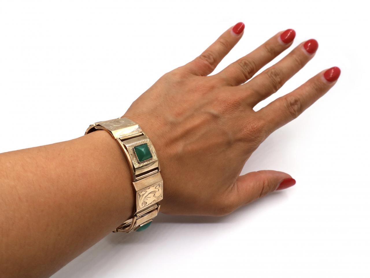 Retro 14kt yellow gold panel bracelet set with jadeite. A wide chunky hollow bracelet consisting of eight square links, alternating with links featuring foliate engravings and links centred with millegrain set square sugarloaf cut jadeite, terminating to a secure push clasp and hinged safety mechanism. Hallmarked 14kt gold. Estimated 19cms in length.