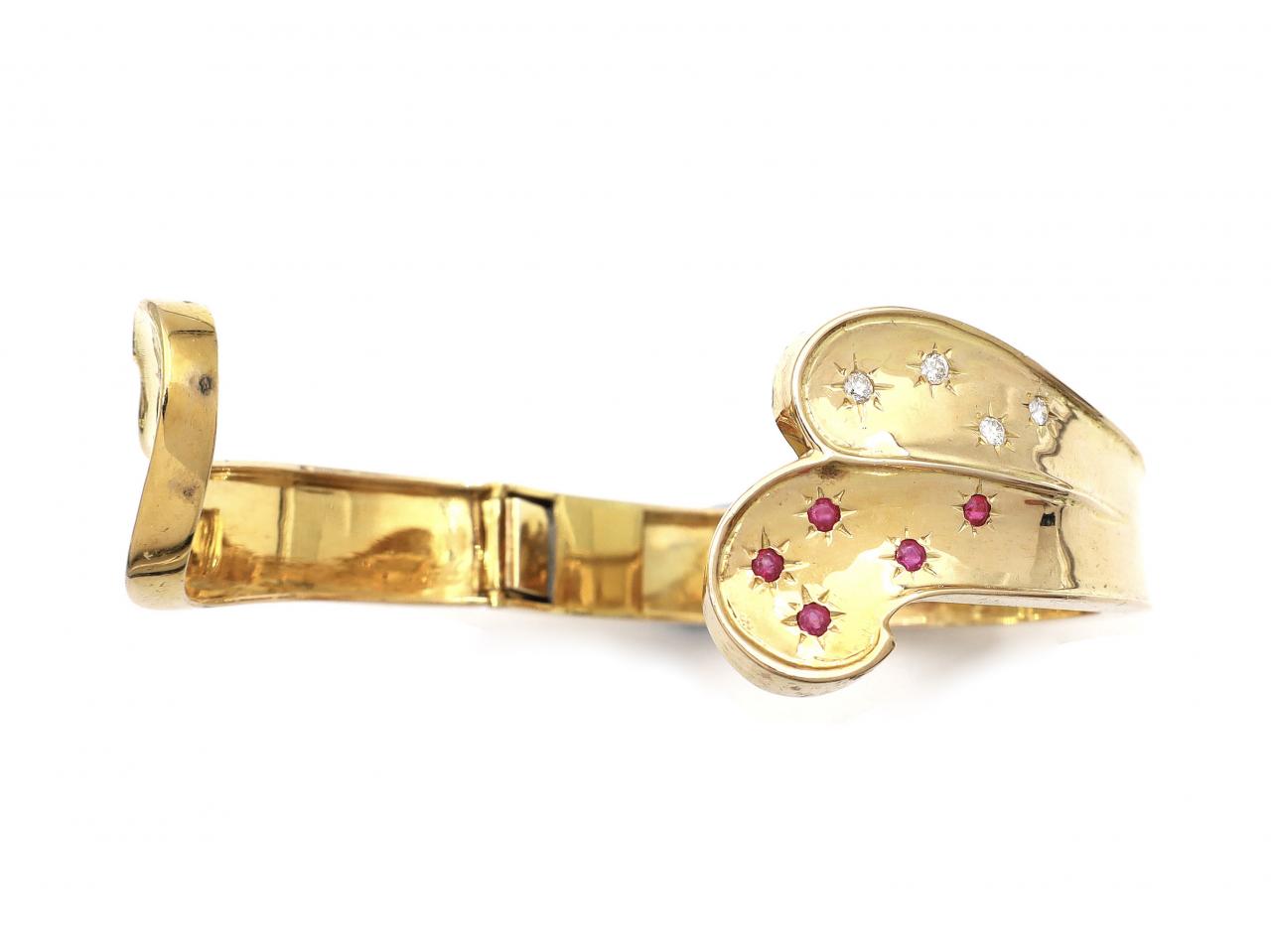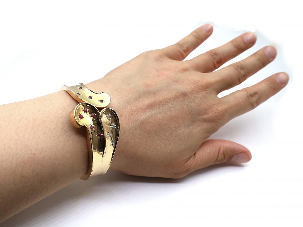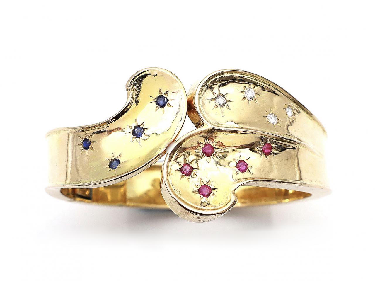Retro 14kt yellow gold sapphire, ruby and diamond hinged bangle. A stylised crossover bangle with a unique front hinge, set in sections with gypsy star set sapphires, rubies and diamonds. Marked 14kt gold.