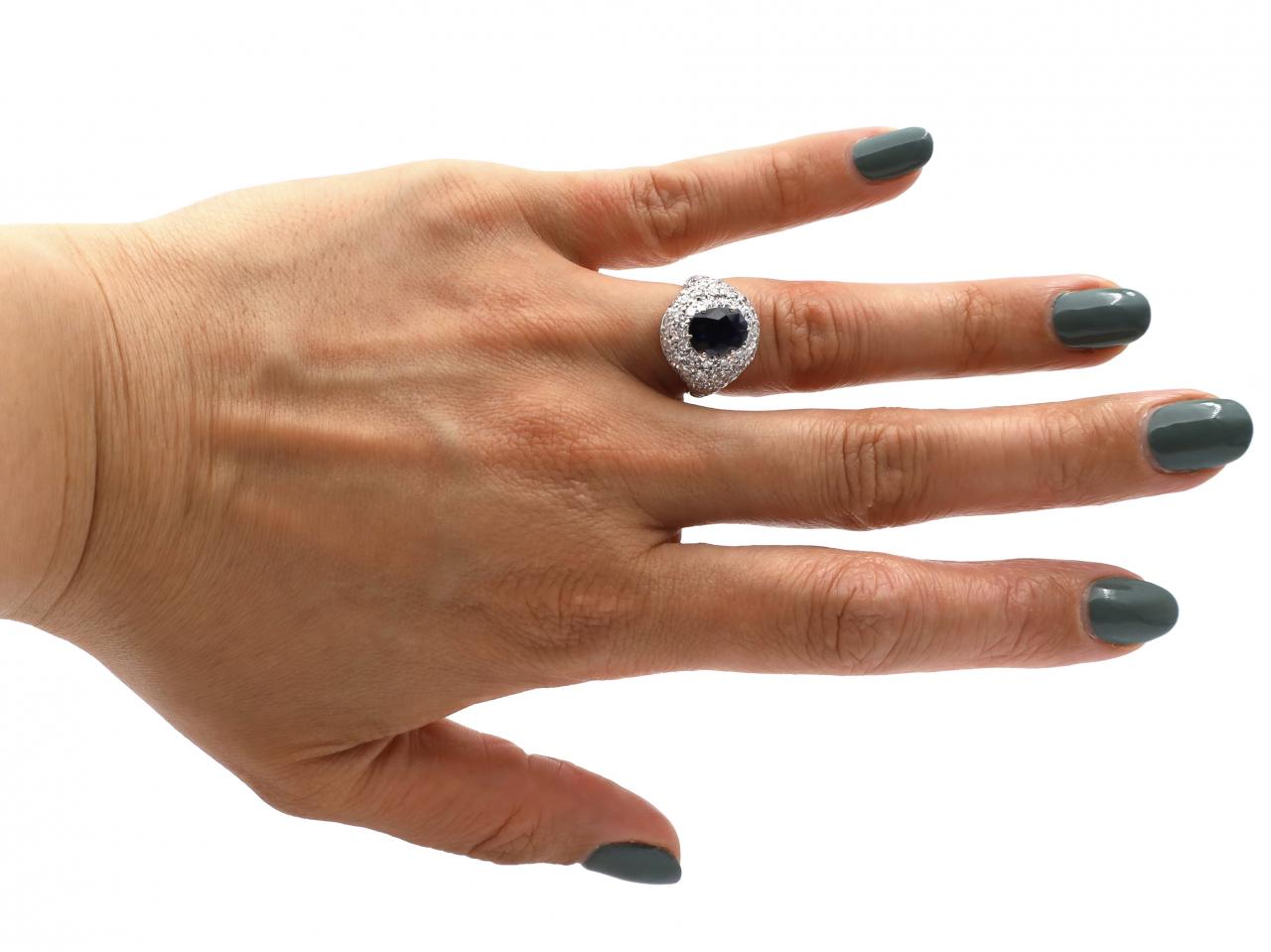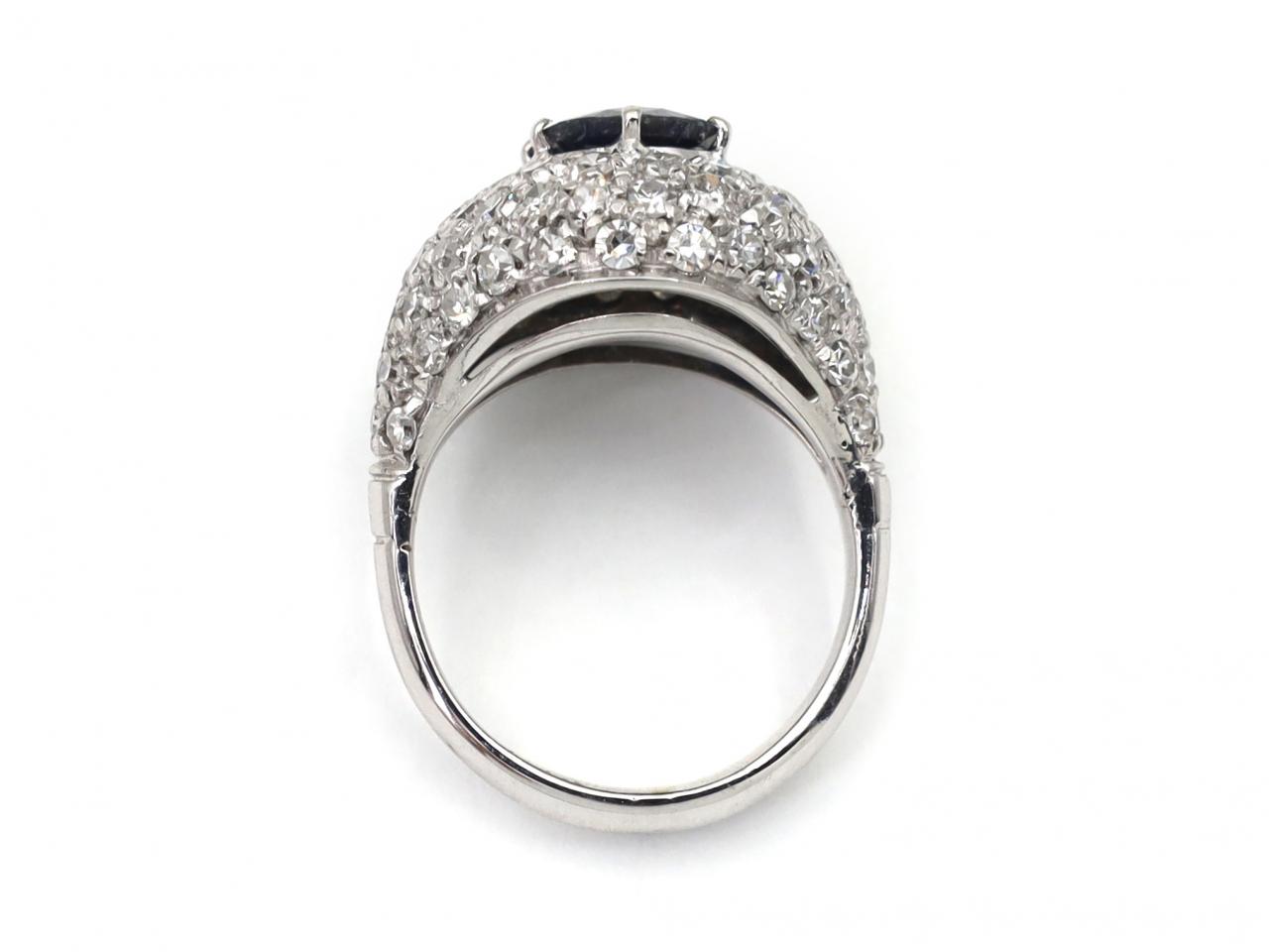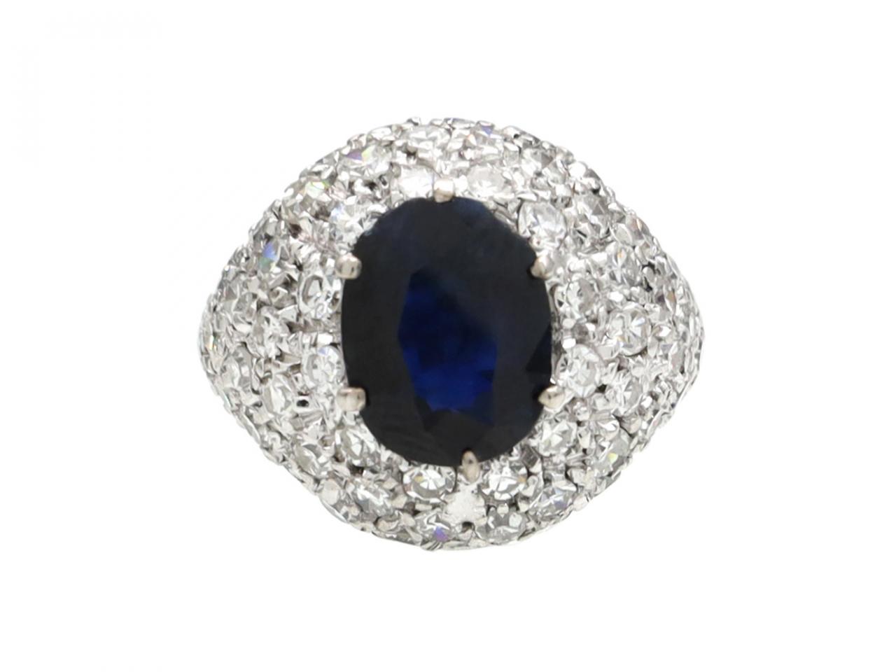 Retro 18kt white gold sapphire and diamond bombé ring. Centrally set with an oval mixed cut sapphire in a raised claw setting, surrounded by round brilliant cut diamonds in pave settings, to a bombé cluster design with integrated shoulders which terminate to a solid shank.