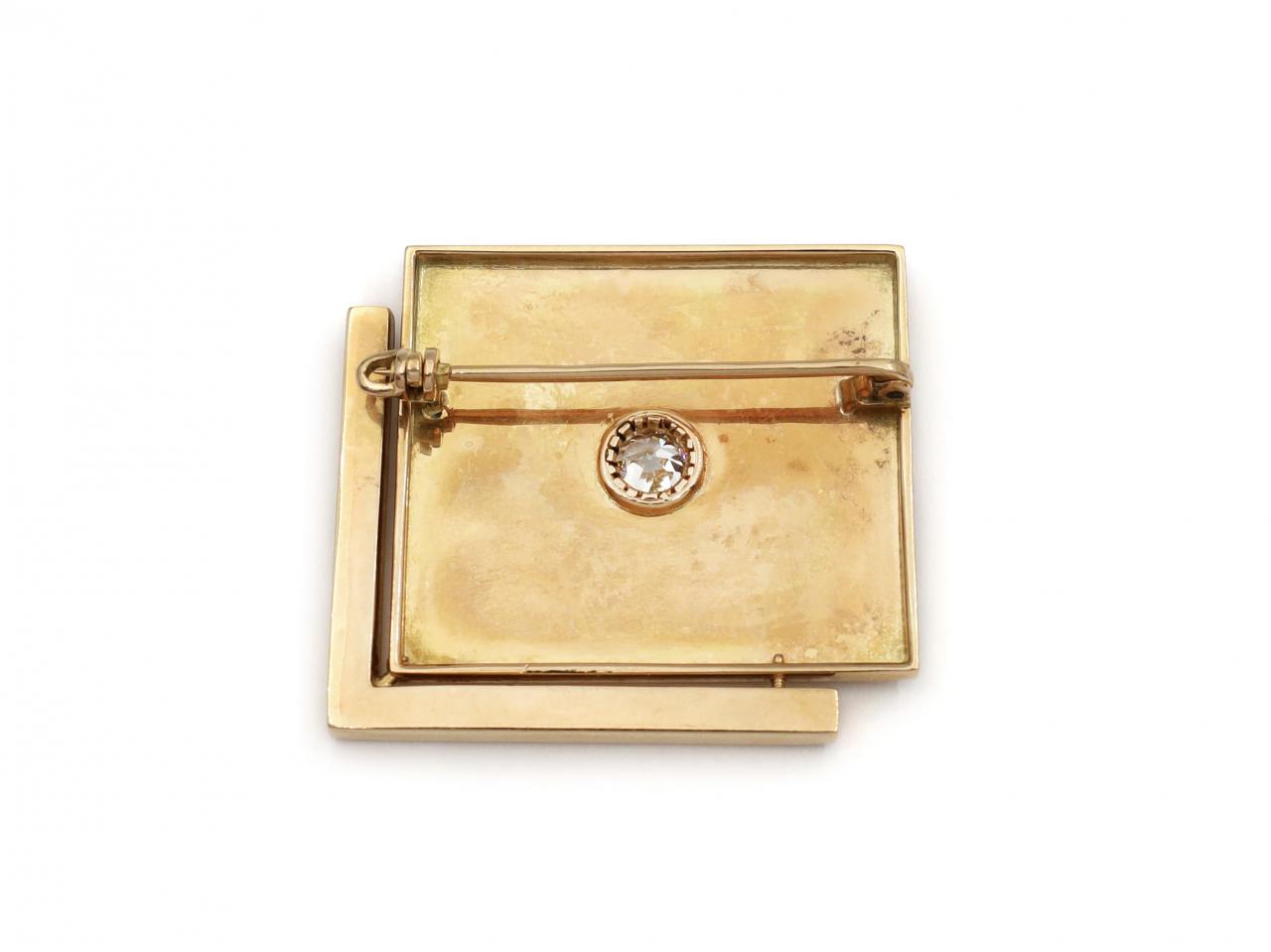 Retro 18kt yellow gold, diamond and ruby square brooch. A square high polished brooch, centrally set with an estimated 0.55ct round Old European cut diamond in a platinum square collet setting, bordered to one right angle with a row of callibre cut rubies in a floating channel setting, secured to the reverse with a hinged pin and safety latch.