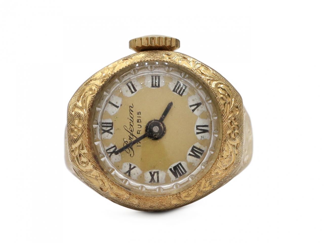 Retro 18kt yellow gold mechanical watch ring with decorative engine turning. Centred with a mechanical seventeen jewel movement with hand painted dial featuring black Roman numerals and black hands, protected by faceted glass and surrounded by a decorative engine turned case and integrated broad shoulders which terminate and smooth to a solid shank, fitted to the side with a manual winder. Marked 18kt gold.