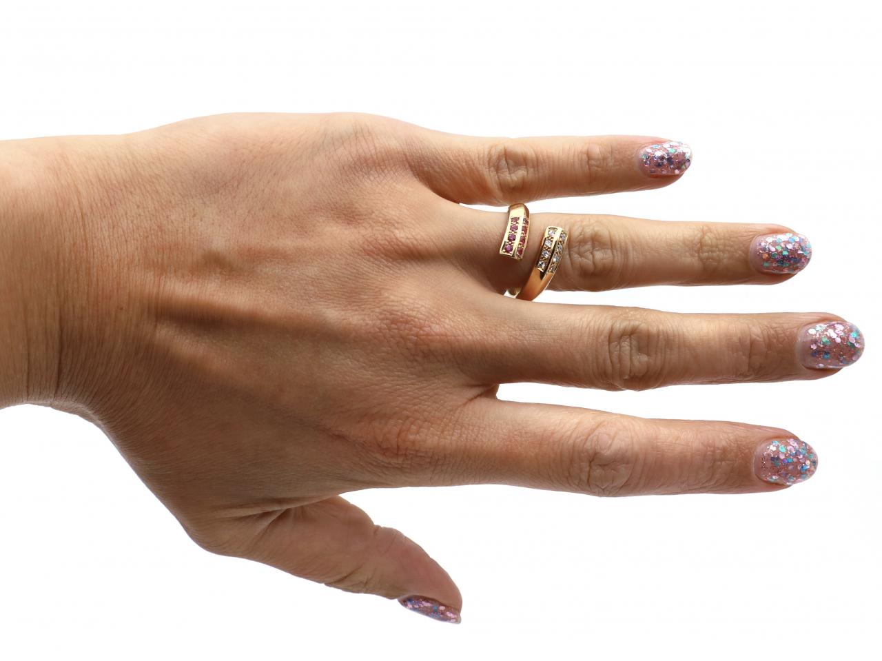 Retro 18kt yellow gold pink sapphire and diamond open twist ring. A champfered ring each open end terminating to a diamond pave set end and a pink sapphire pave set end.
