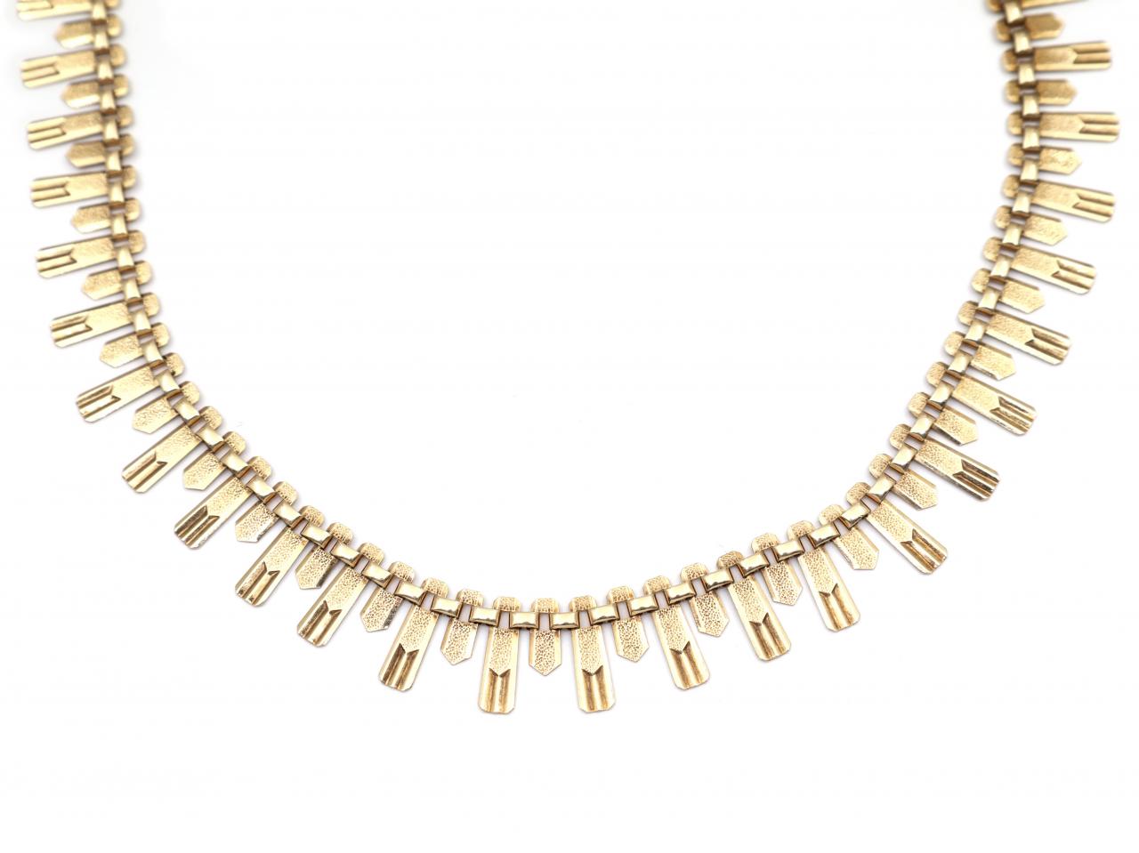 Retro 9kt yellow gold Cleopatra fringe necklace featuring articulated step links with matte and polished decoration, fitted to the reverse with a secure bolt ring. Marked 9kt gold.