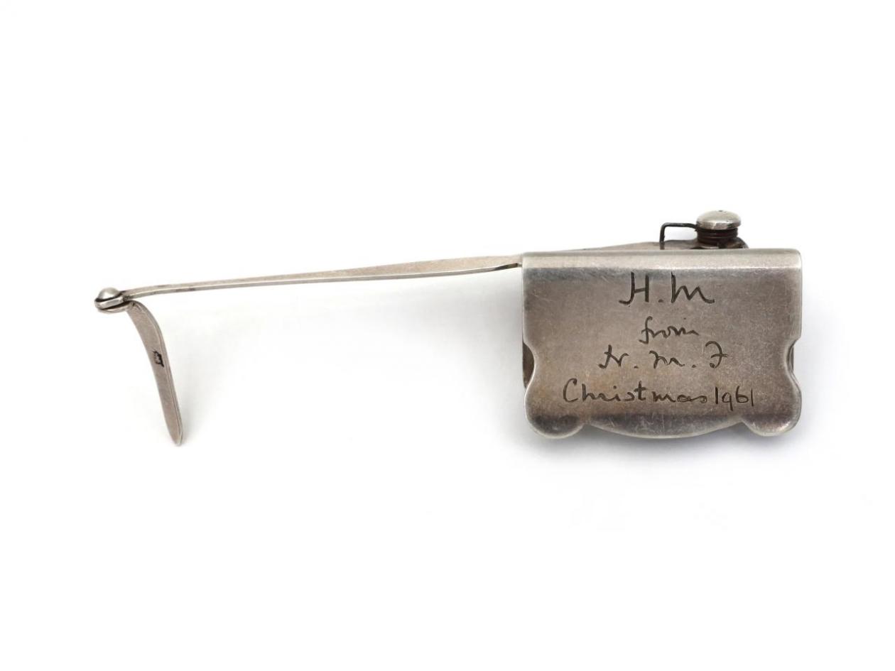 Retro Asprey bookmark and page holder in sterling silver. A bookmark consisting of a rectangular clip fitted to the reverse with a spring and hinged arm used to keep the book open. Engraved to the plaque 'H.M FROM N.M.J CHRISTMAS 1961'. Signed 'Asprey London'. A perfect gift for avivd readers and bookworms!