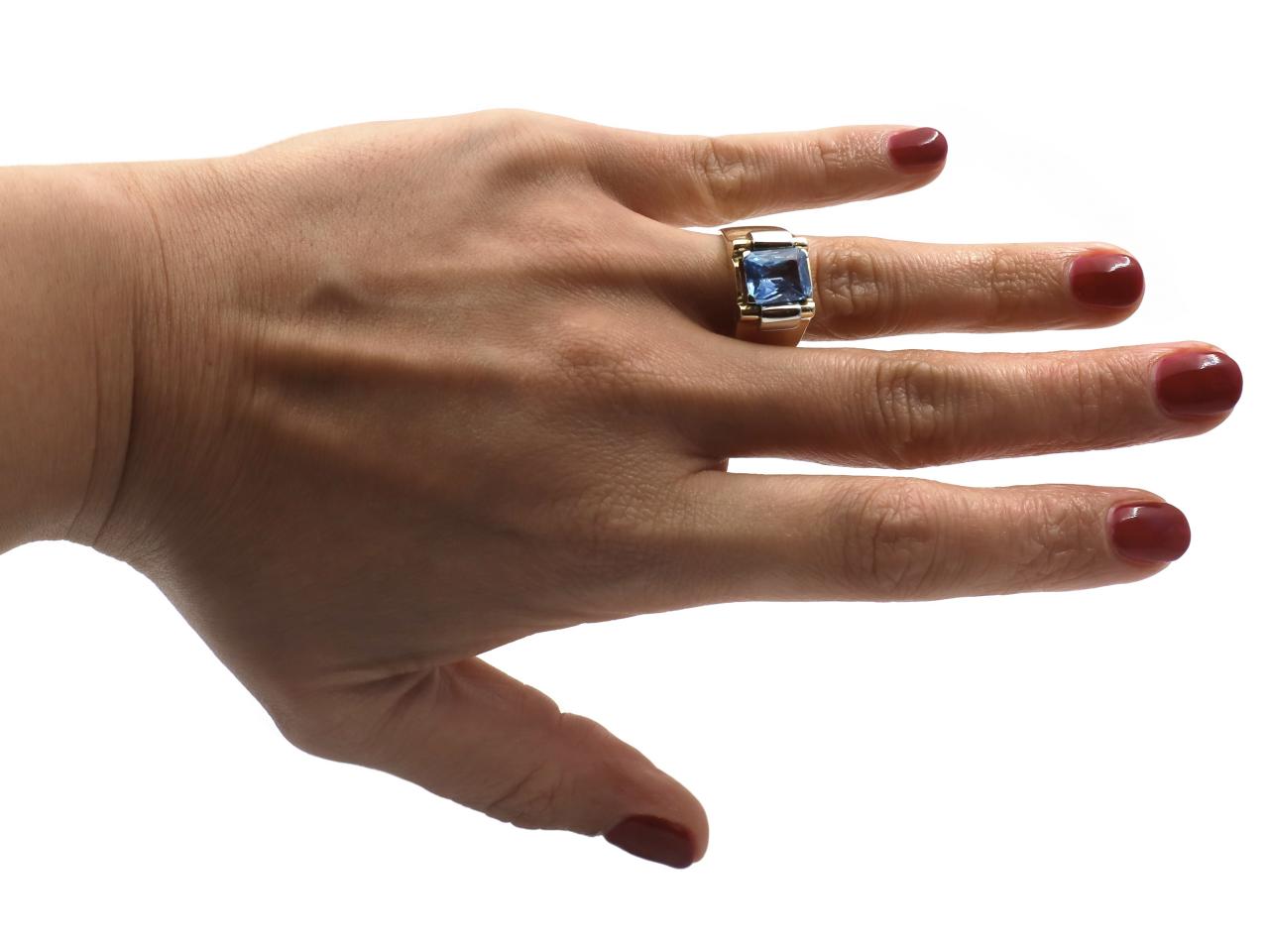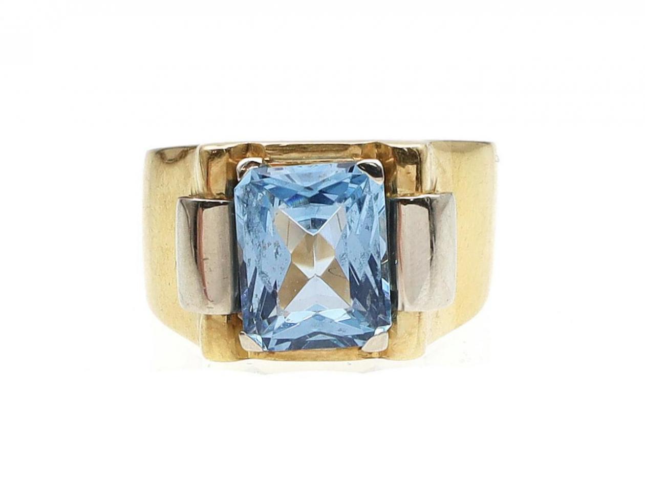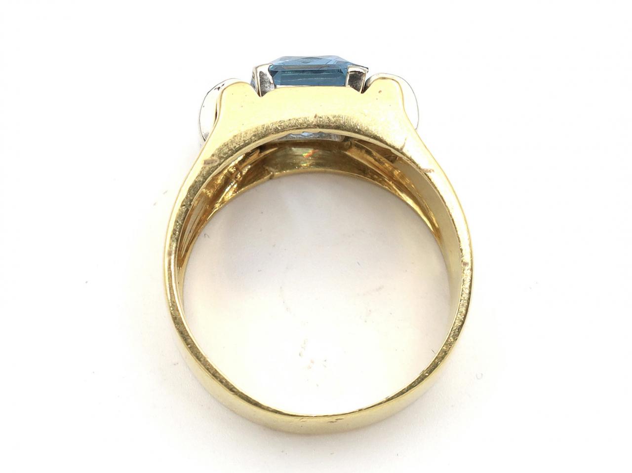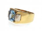 Retro blue topaz two tone white and yellow gold ring. Set with a rectangular scissor cut blue topaz in a four claw setting, to a structural design with three-dimensional elements and broad shoulders which taper to a solid shank.