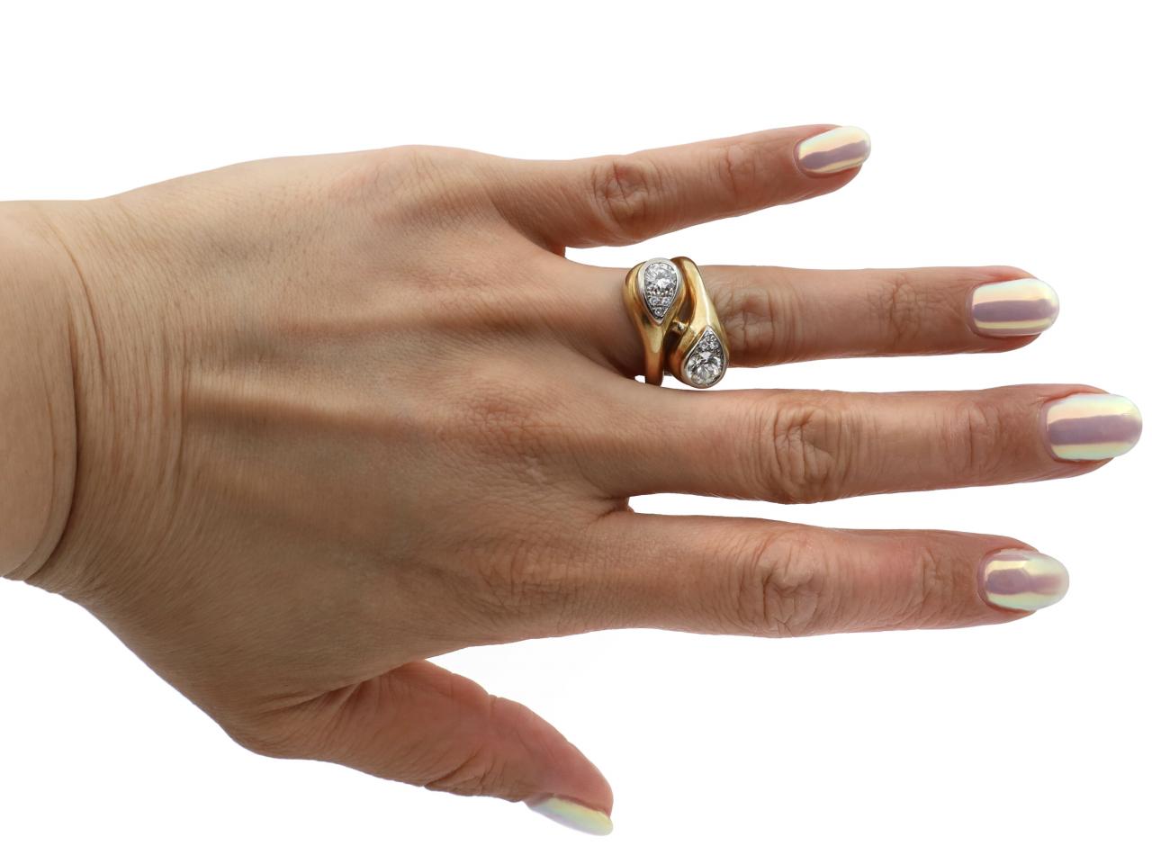 Retro diamond set bypass ring in 18kt yellow gold. Set with an estimated 0.50ct round Old European cut diamond in a grain and half rubover setting, adjacently set with an estimated 0.50ct round brilliant cut diamond in a grain and half rubover setting, further enhanced with six round eight cut diamonds in grain settings, to a chunky two stone design with pear shape terminals polished surround and twisting shoulders which flow to a solid shank. Marked 18kt gold.