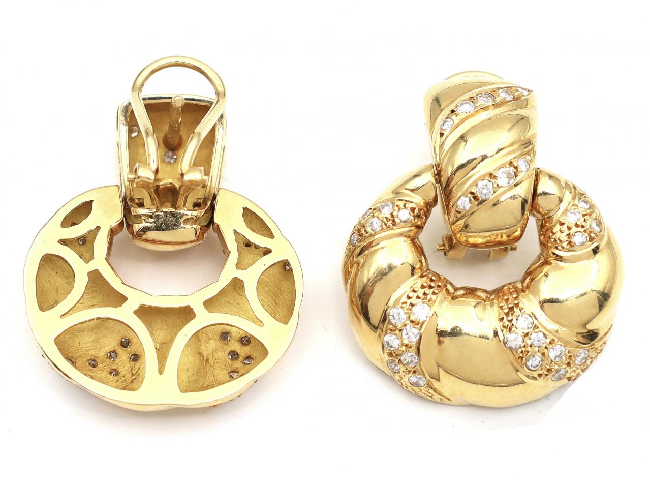 Retro diamond set twisted rope openwork drop earrings in 18kt yellow gold. A matching pair of drop earrings, each consisting of a rounded tapered surmount with diagonal incised twist details, suspending a graduating twisted hoop mirroring the pattern from the surmount, fitted to the reverse with a secure post and hinged omega backing.