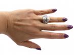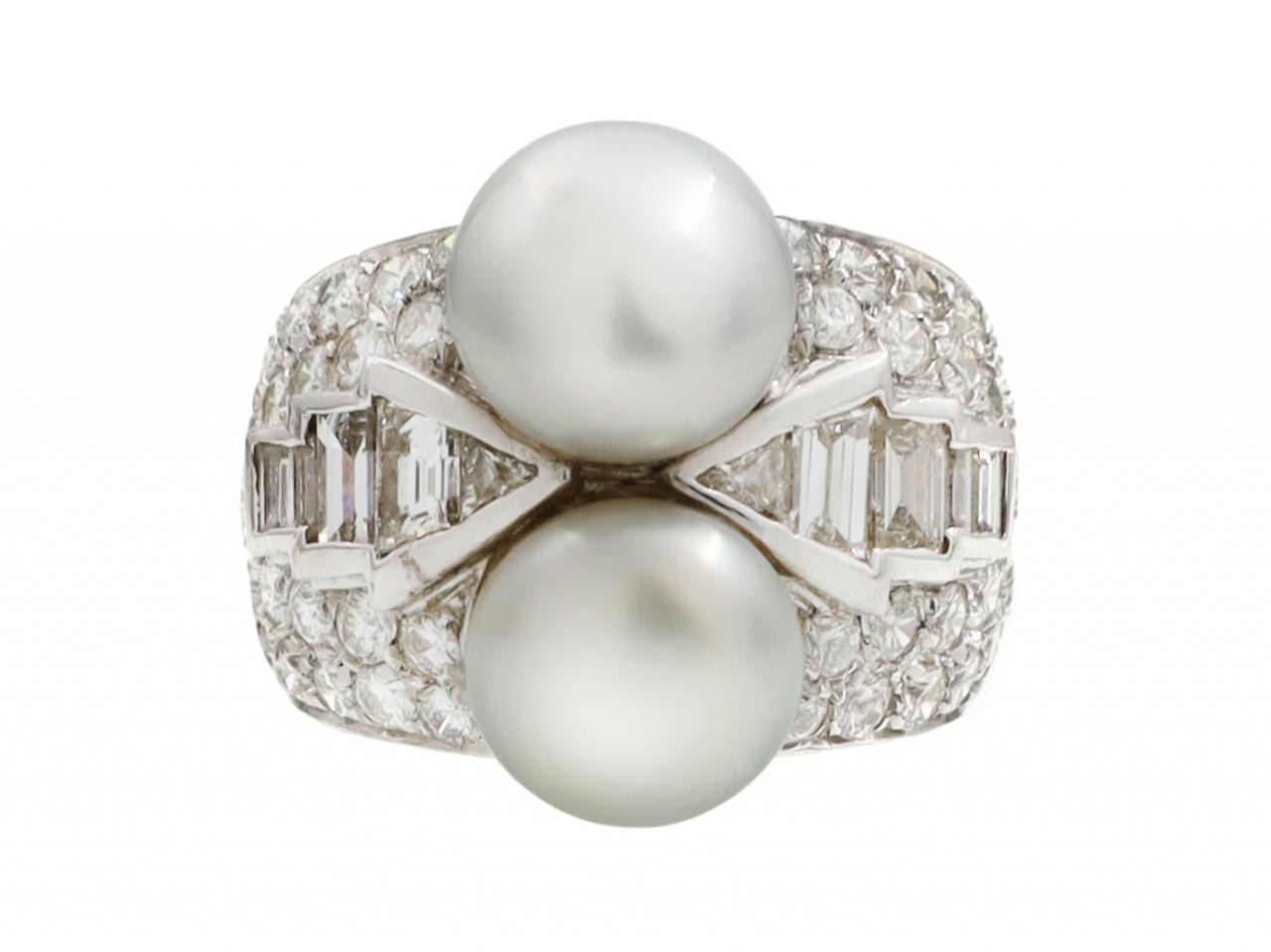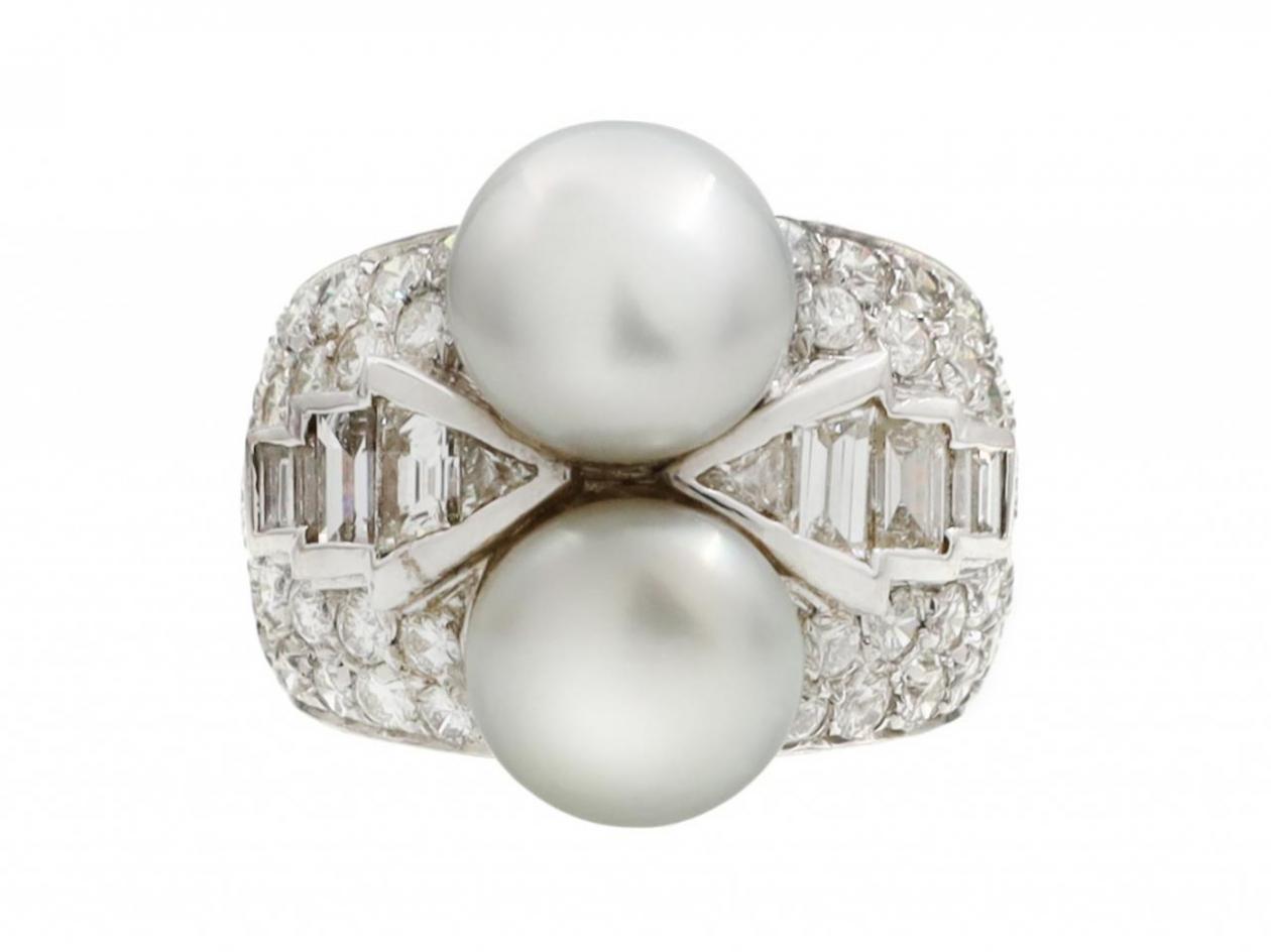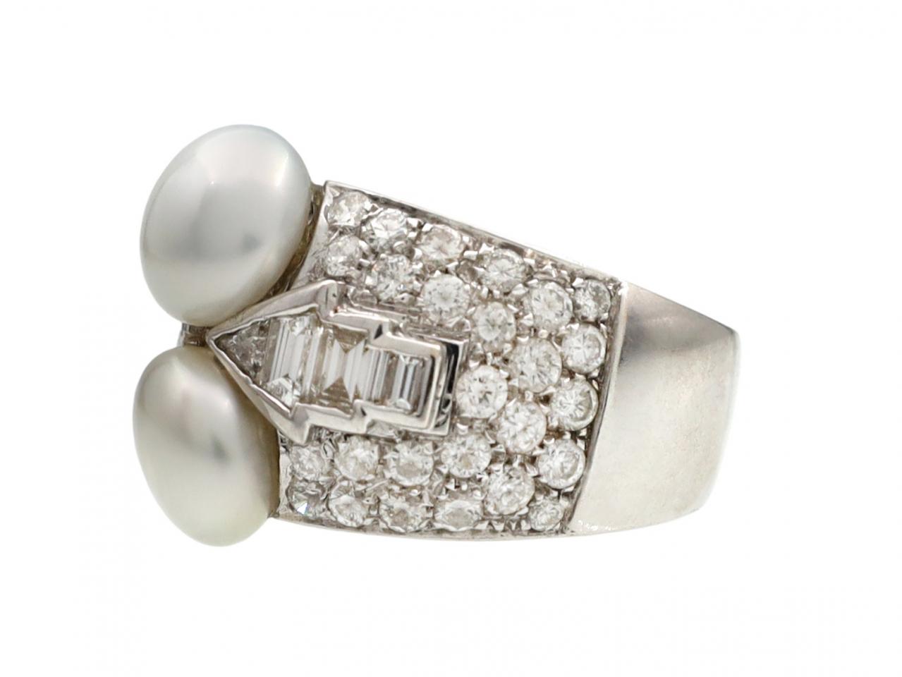 Retro double pearl and diamond cocktail ring in 18kt white gold. Centred with two vertically set cultured pearls flanked to either side with two triangular trillion cut diamonds in rubover and channel settings, further set with eight baguette cut diamonds in channel settings and surrounded by fifty two round brilliant cut diamonds in pave settings, to a two stone bombe cluster design featuring two pointed arrow motifs and raised structured gallery, the integrated shoulders terminate to a broad solid shank. Marked 18kt gold. Accompanied by Gemological Institute of America certificate no.6223979182.