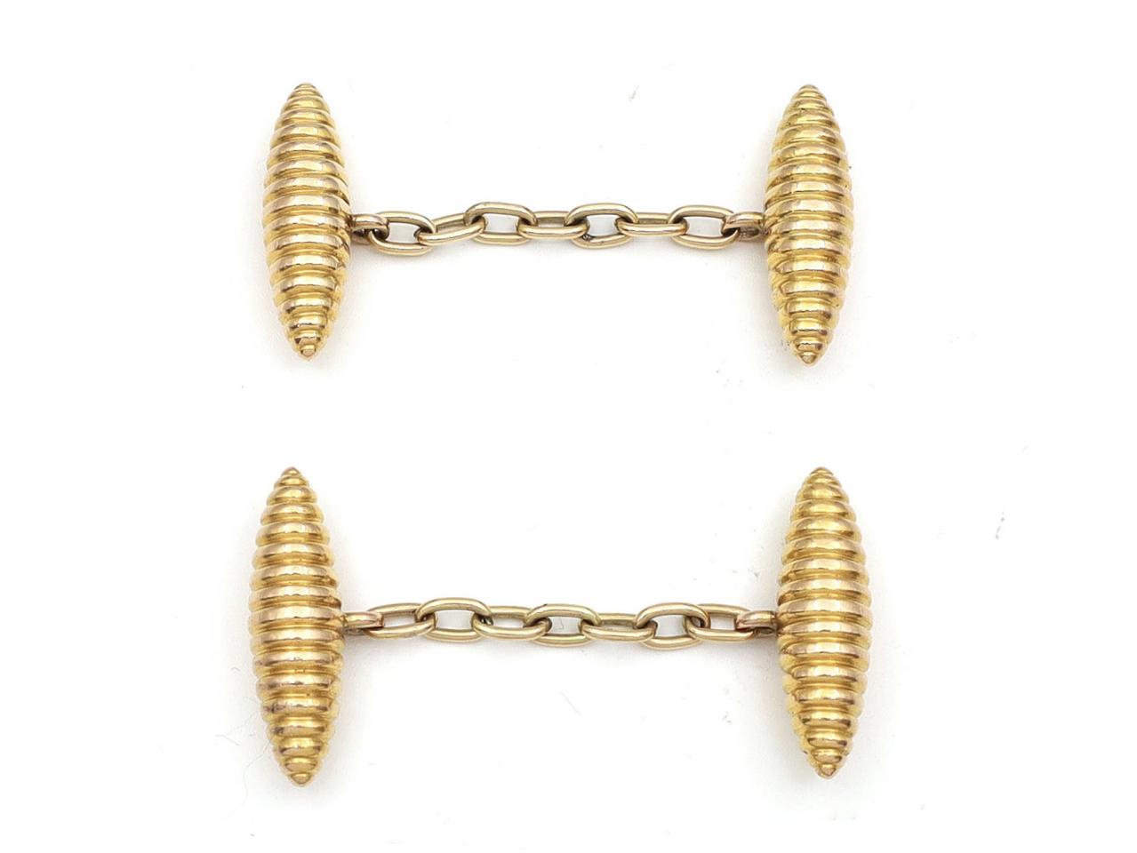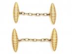 Retro double ribbed torpedo cufflinks in 18kt gold. A matching pair of cufflinks, each consisting of two linear ribbed torpedos connected by belcher chain. Hallmarked 18kt gold.