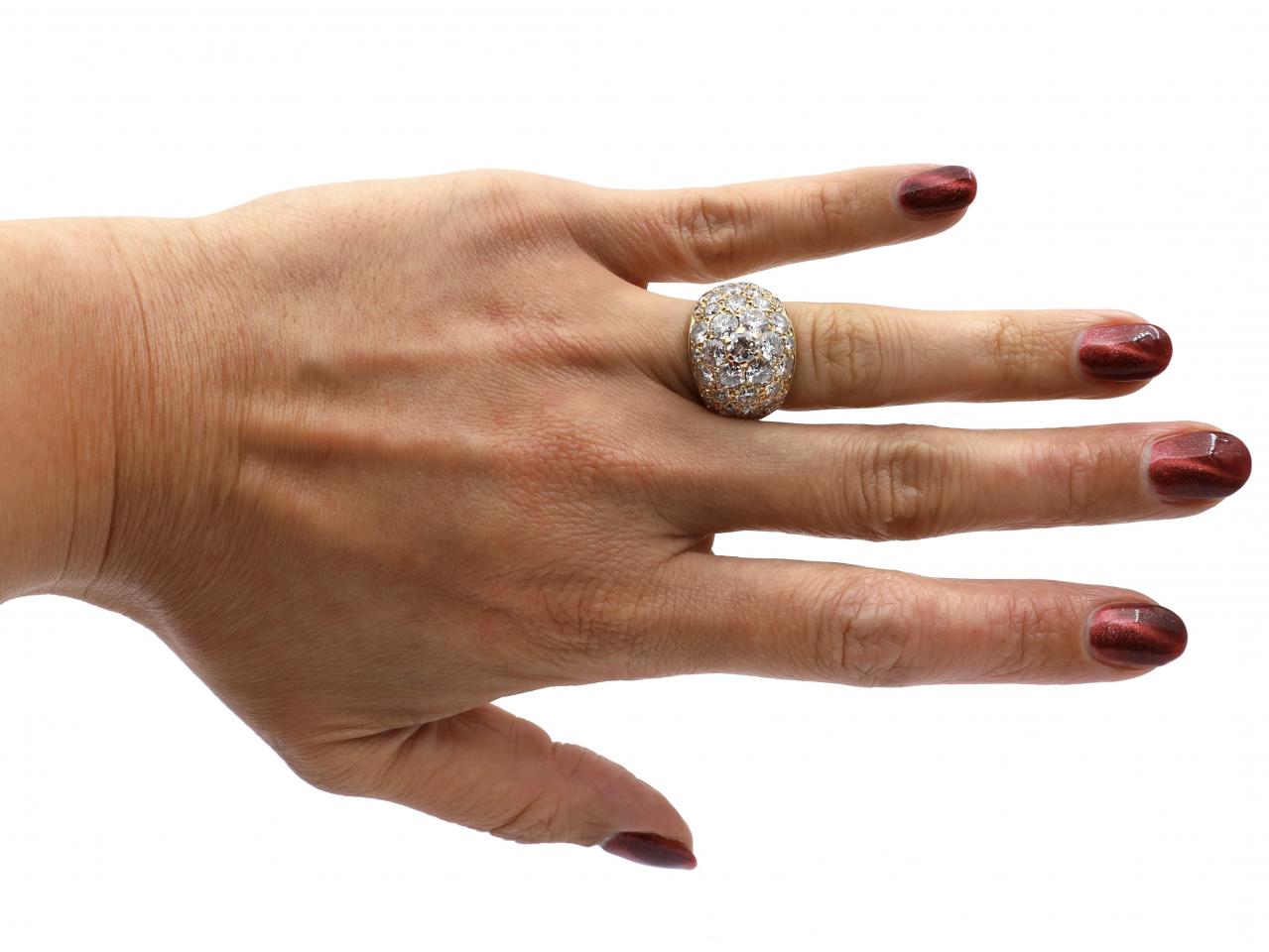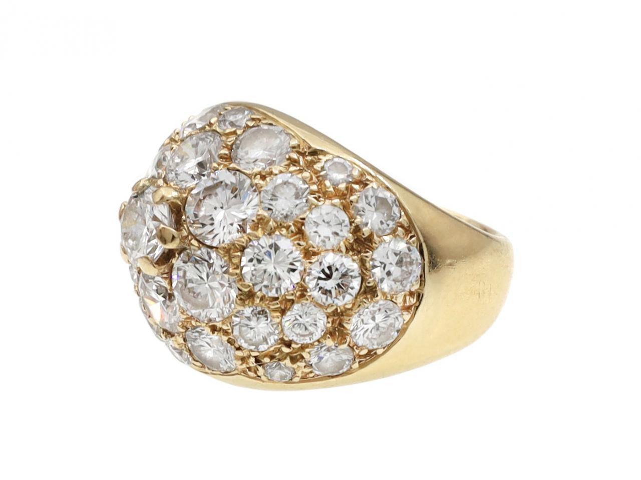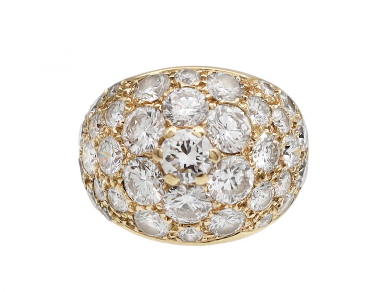 French diamond bombe cluster ring in 18kt yellow gold. Set with thirty six round brilliant cut diamonds in claw and pave settings, to a stylish bombe cluster design with intricate settings, polished gallery and chunky integrated shoulders which smooth to a broad shank. Estimated total diamond weight 4.00cts. Hallmarked 18kt gold, French.