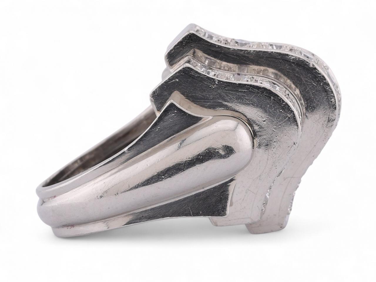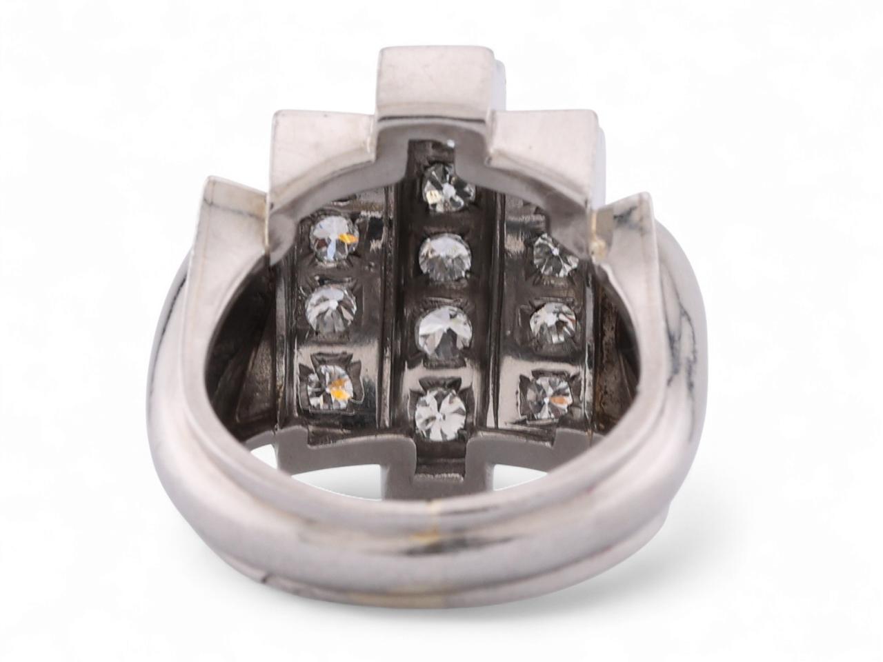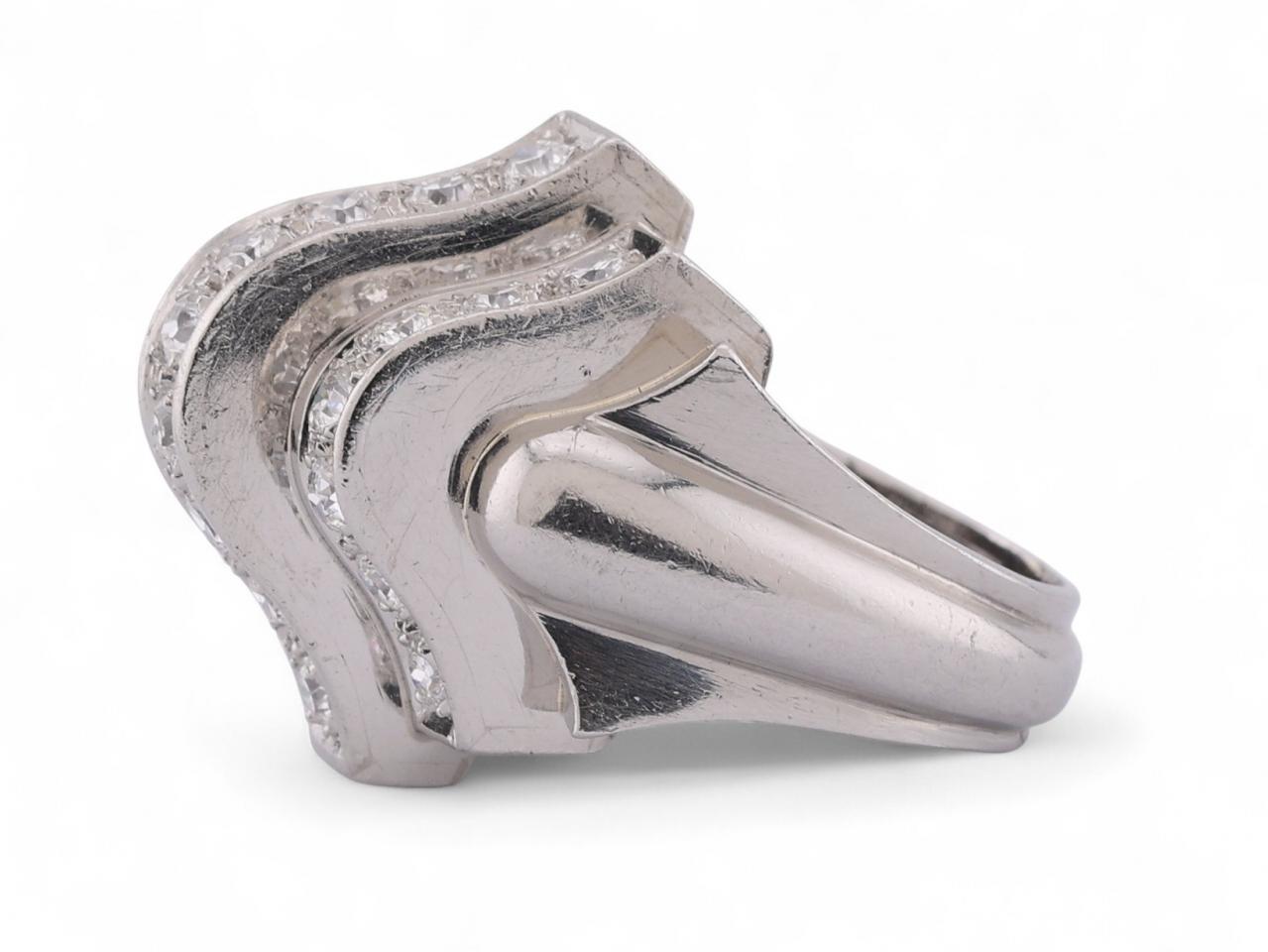 A Retro French ring, circa 1940s, of stepped architectural design set throughout with old cut diamonds. The stones are estimated to weigh a total of 1.15 carats, assessed as F–G colour and VS–SI clarity. Mounted in platinum with solid shoulders and tapering band.