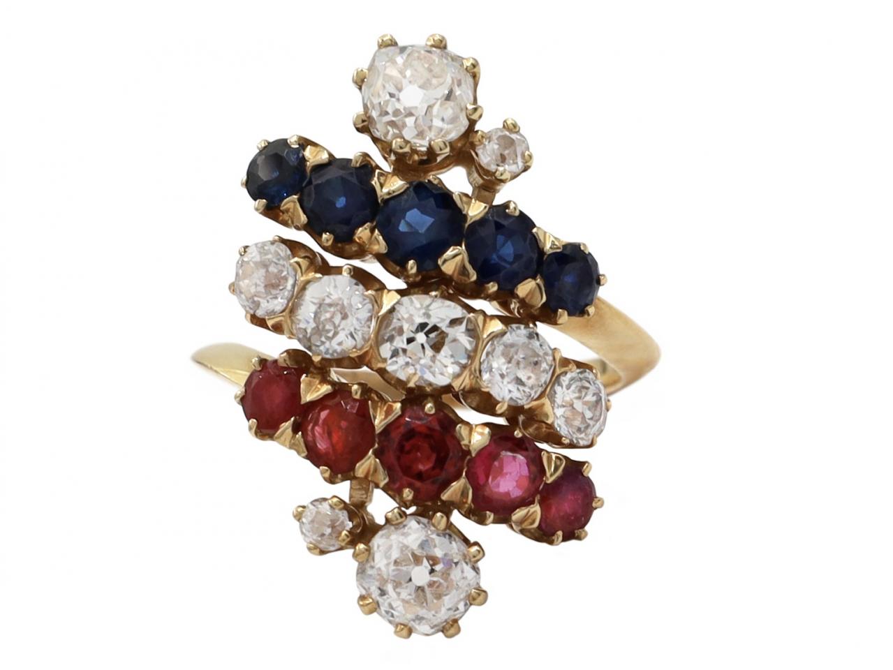 Retro Old Mine cut diamond, sapphire and ruby cluster ring in 18kt yellow gold. Set with nine cushion shape Old Mine cut diamonds in claw settings, further set with five round mixed cut sapphires in claw settings and five round mixed cut rubies in claw settings,