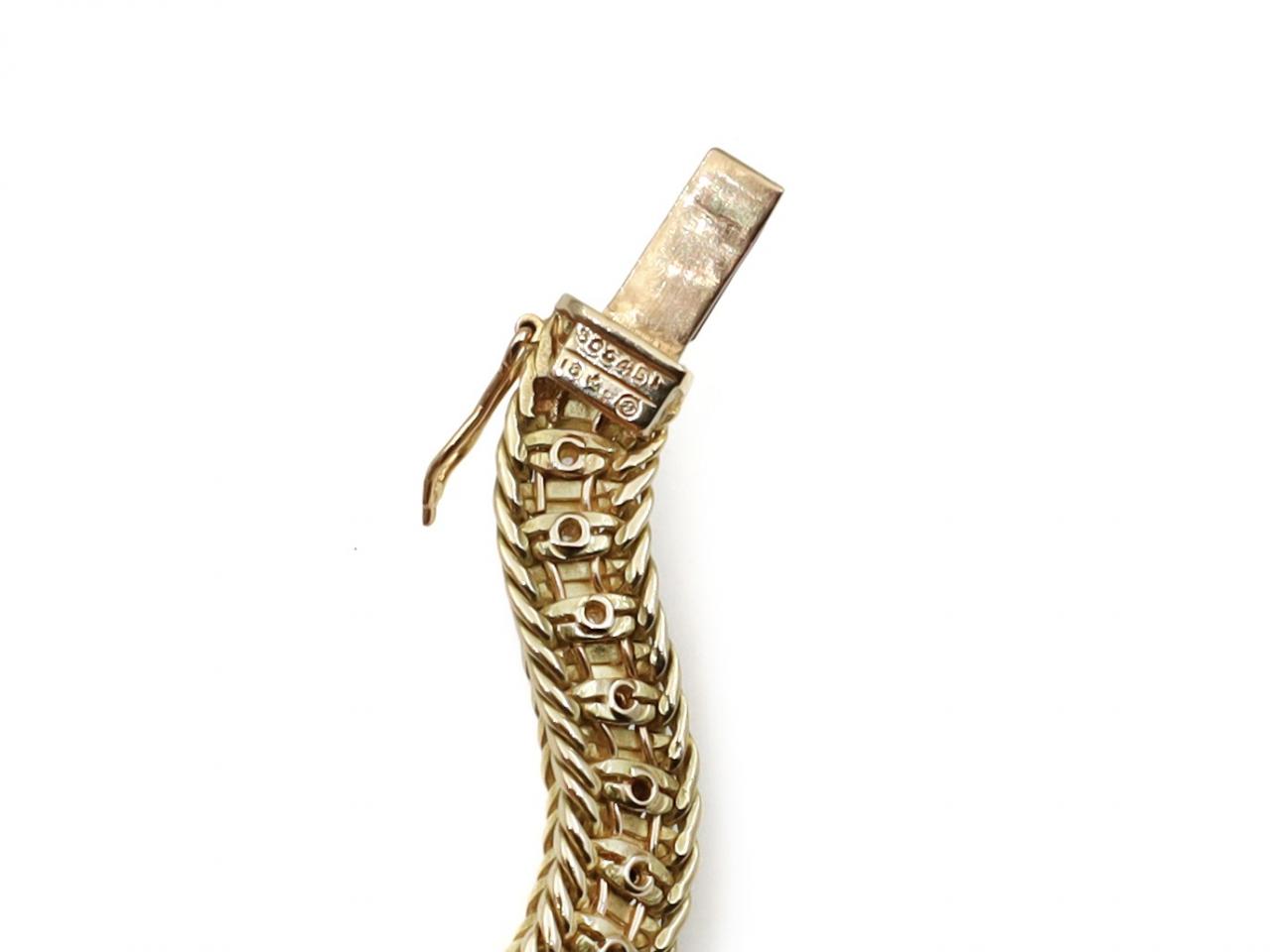 Retro Oscar Heyman Bros. diamond set woven wave bracelet in 18kt yellow gold. An undulating bracelet curving to fit the wrist, set the the centre with an unbreaking row of round brilliant cut diamonds in hidden claw settings, fitted to top and bottom with a border of woven 18kt yellow gold, terminating to an integrated push clasp mechanism and safety latch. Estimated total diamond weight 6.00cts. Hallmarked 18kt gold. Maker's mark Oscar Heyman Bros.