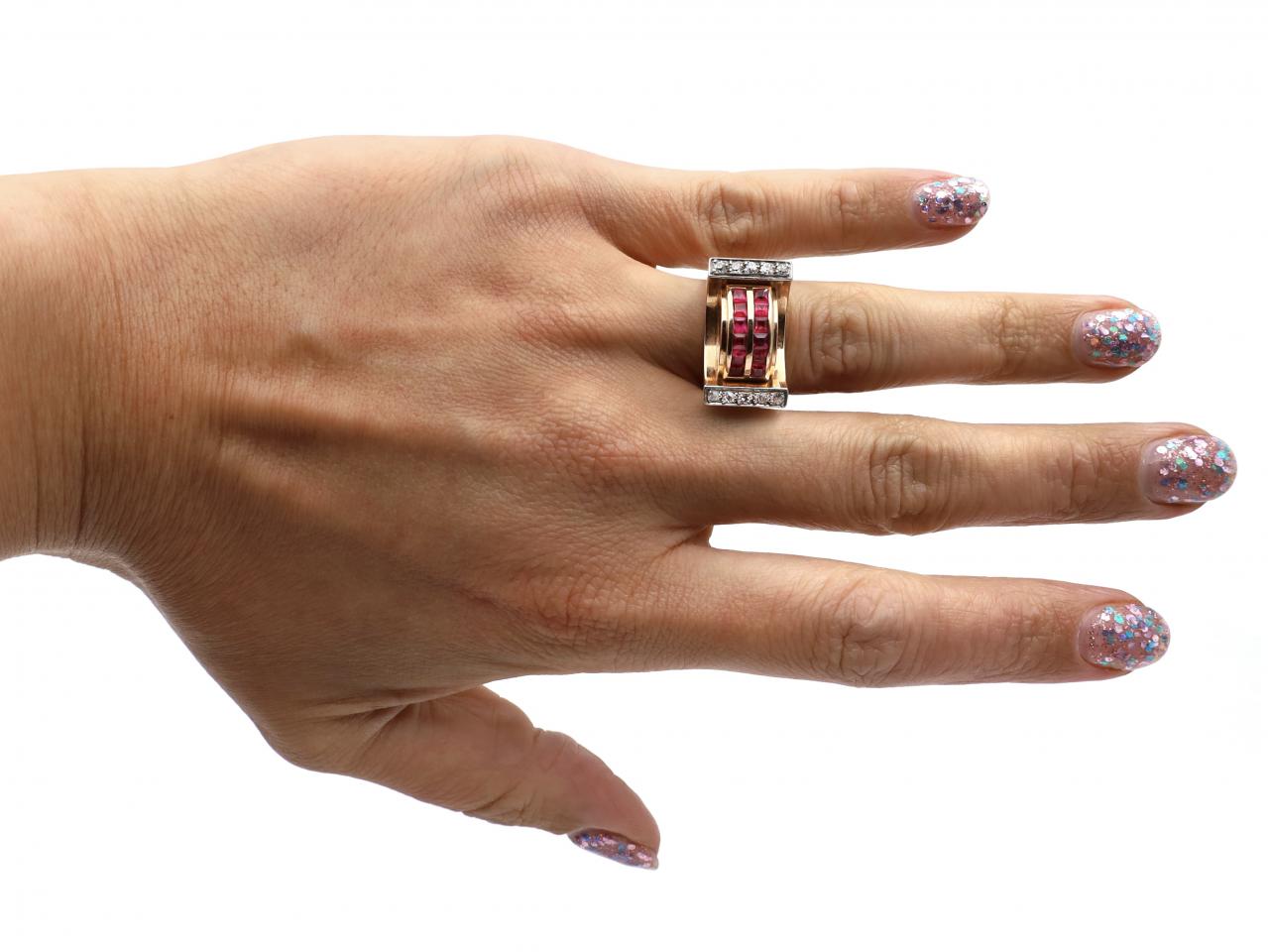 Retro synthetic ruby and diamond tank ring in 18kt gold. Centred with two row of square step cut rubies in channel settings, to a three-dimensional tank ring featuring polished settings, to either side raised vertical diamond set terminals flanked by raised broad integrated shoulders which slightly taper to a solid shank.