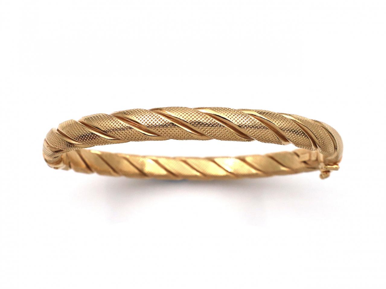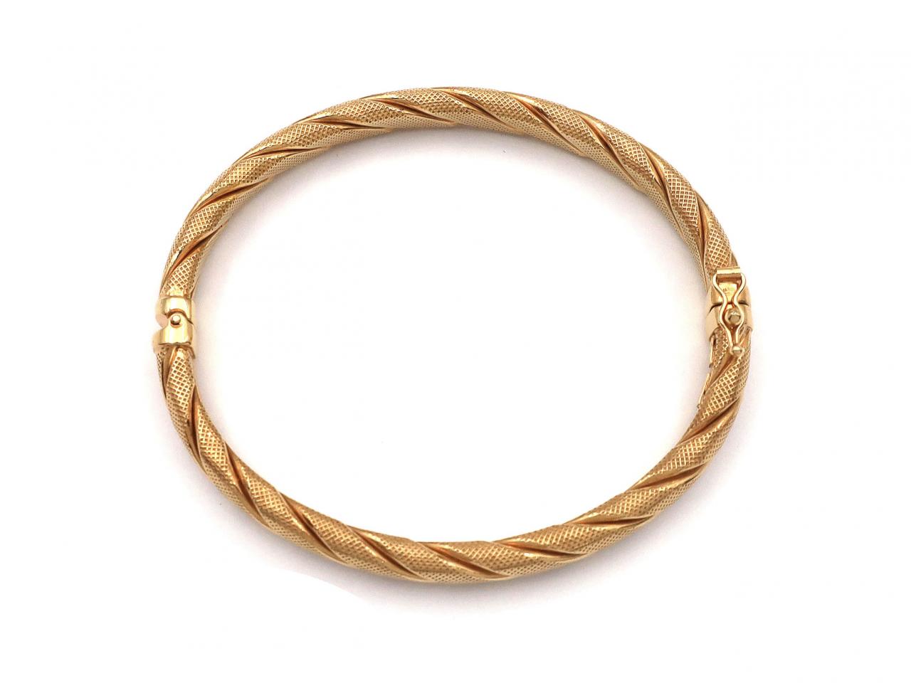 Retro textured twisted rope spring bangle in 9kt yellow gold. A hollow bangle consisting of a twisted rope pattern with a textured finish with a hinged spring opening with a safety latch. Marked 9kt gold, Italian.