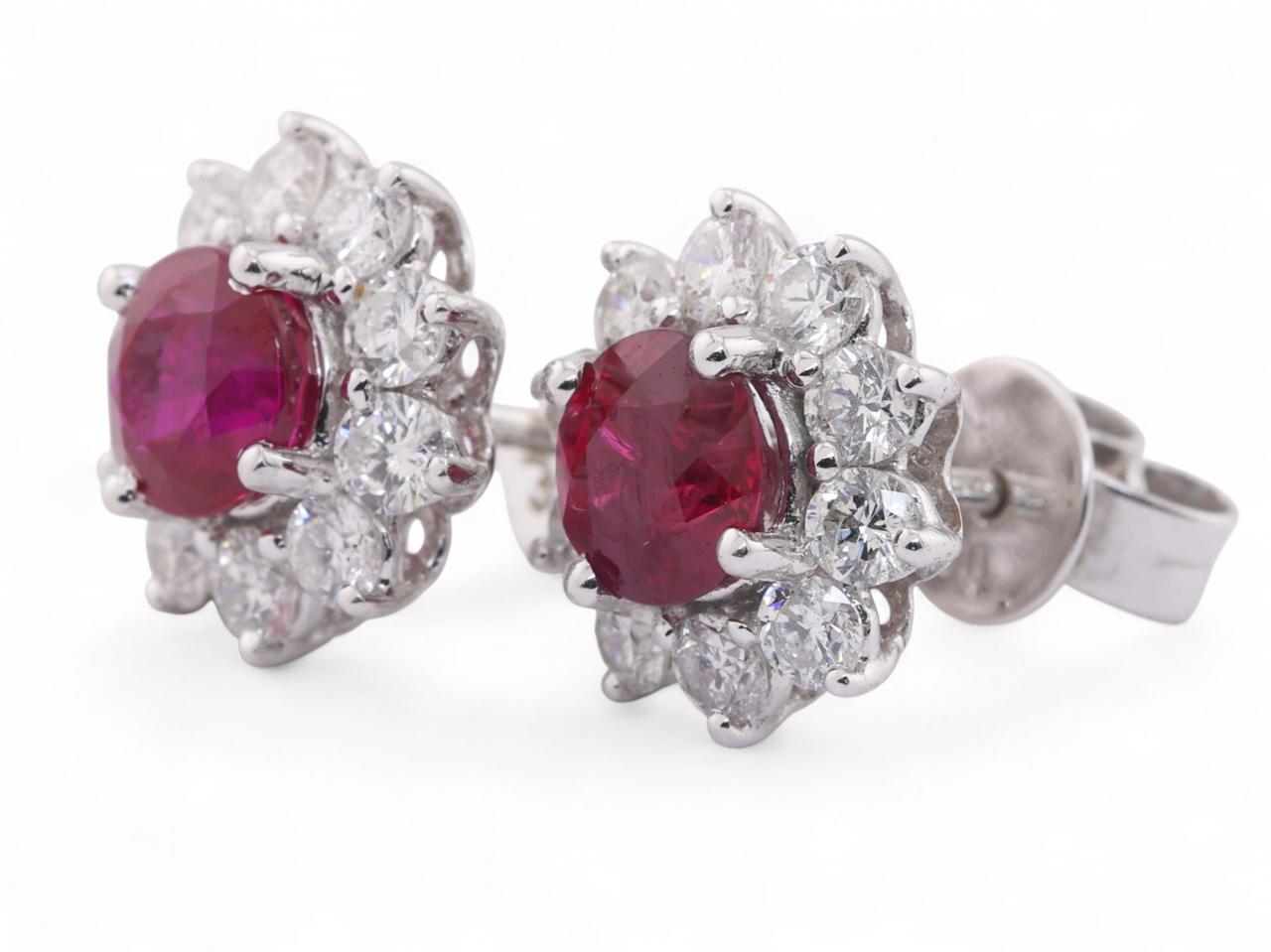 A pair of cluster earrings, each centred with a circular-cut ruby surrounded by brilliant-cut diamonds. The rubies are estimated to weigh a total of 1.60 carats, with diamonds estimated at 0.80 carats combined. Mounted in yellow gold with white settings.
