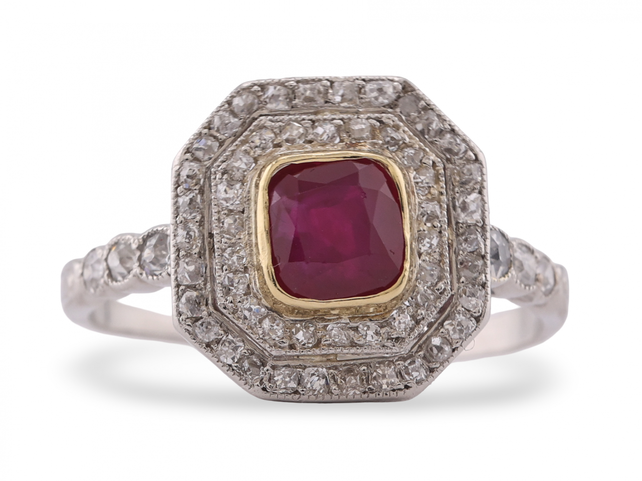 A striking Art Deco cluster ring centred on a cushion-cut ruby set in a yellow gold closed-back bezel, framed by a double octagonal halo of small diamonds in a platinum or white metal mount. The geometric octagonal form is characteristic of the Art Deco period, with clean architectural lines and precise symmetry throughout.