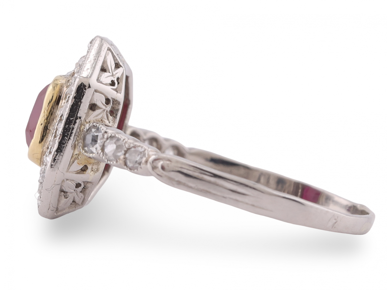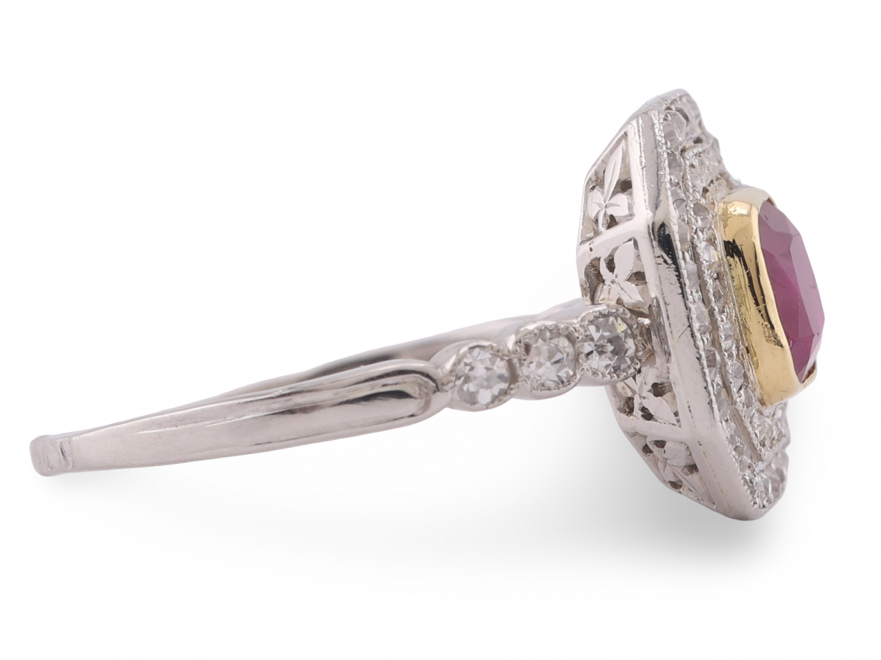 The ruby displays good colour saturation and sits slightly proud of the double diamond surround, giving the piece real presence on the hand. Small round-cut diamonds extend down each shoulder, adding further sparkle without overwhelming the central stone.