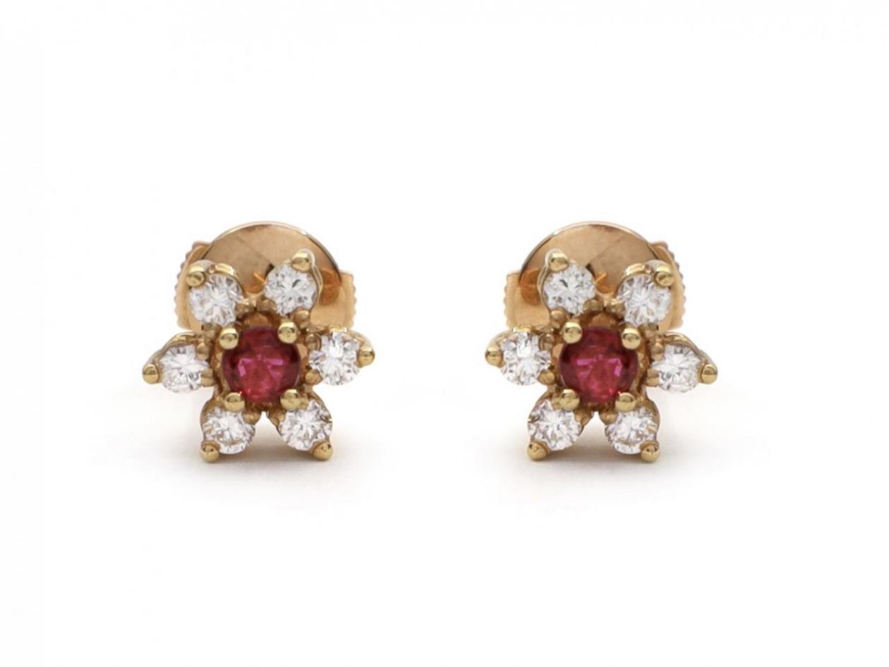 Ruby and diamond flower cluster earrings in 18kt yellow gold. A matching pair of earrings, each centred with a round mixed cut ruby in a four claw setting, surrounded by six round brilliant cut diamonds in claw settings, to a floral cluster design featuring curving claws, open gallery and fitted to the reverse with a secure post and push disk. Marked 18kt gold.