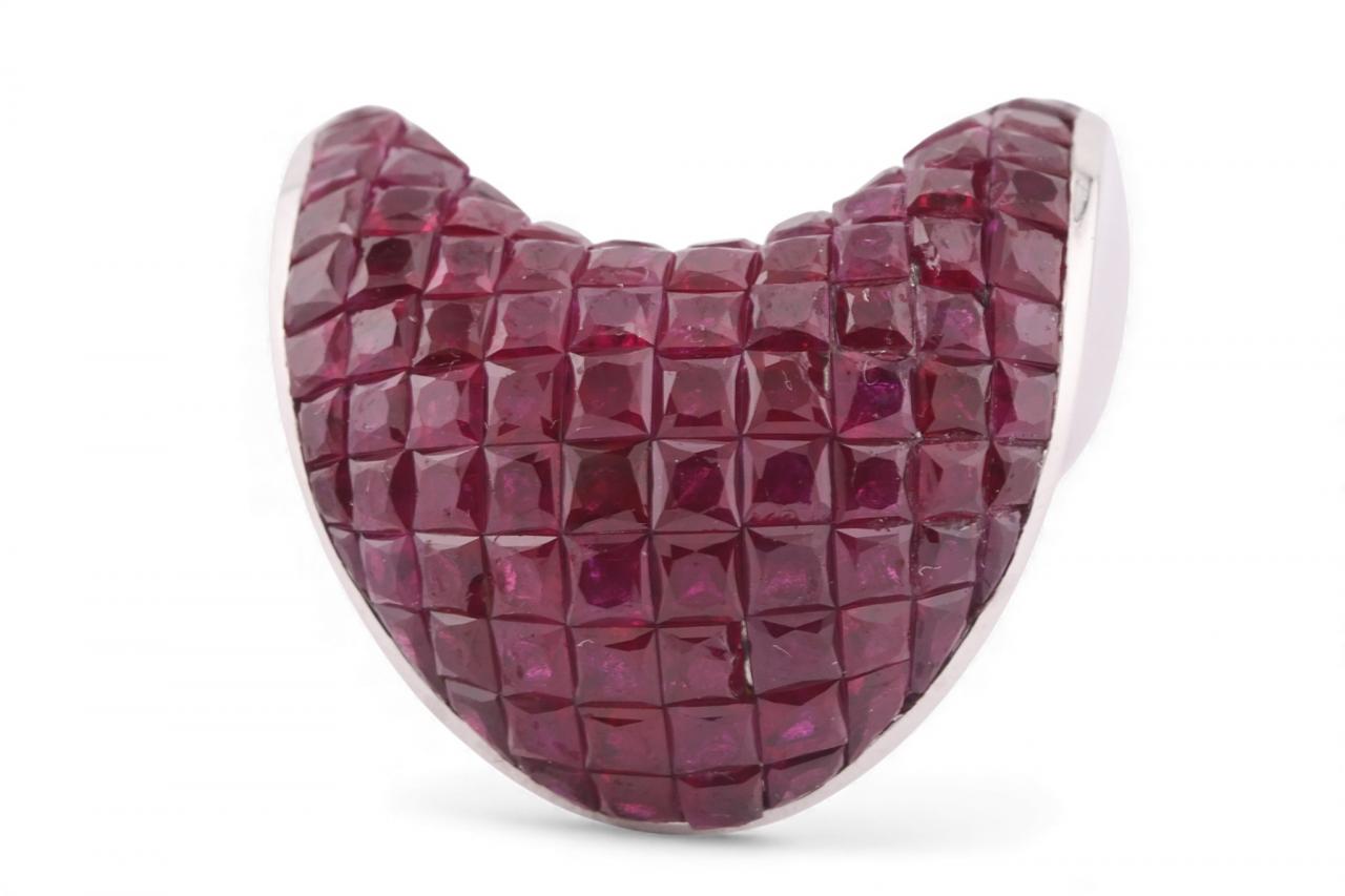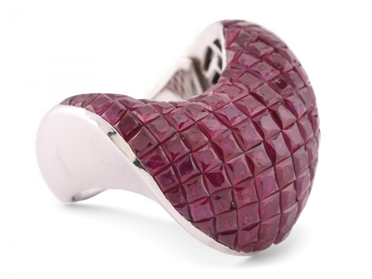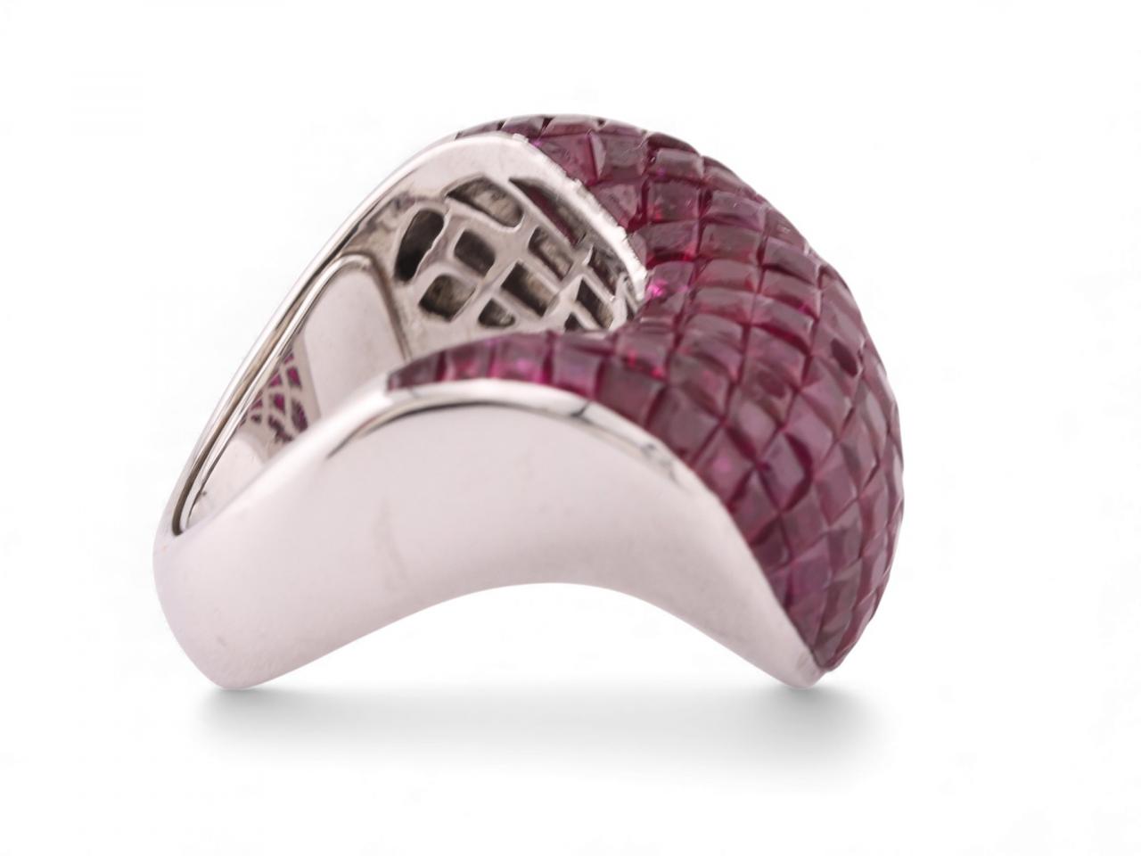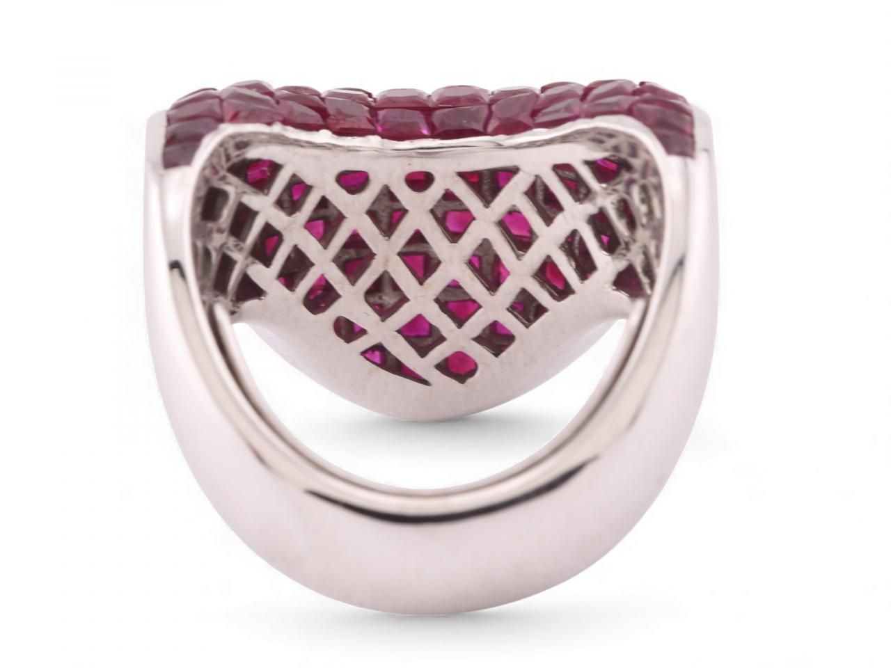 A sculptural ruby ring by Damiani crafted in 18k white gold. The ring features a bold curved form that rises in a smooth wave across the finger. The surface is set with tightly placed calibre cut rubies in an invisible style grid. The stones sit in a contoured field that flows into the polished white gold shoulders. The interior shows Damiani signature workmanship with precise lattice under-gallery work to allow light through the rubies. This is a striking contemporary Italian designer piece with a strong presence on the hand.