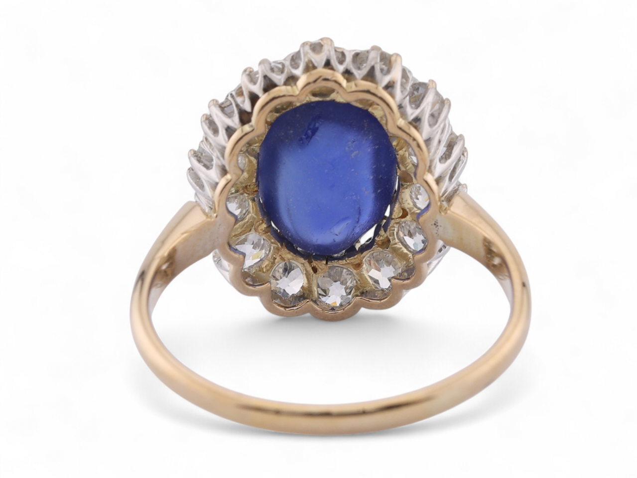 A sapphire cluster ring set with a cabochon star sapphire weighing 5.67 carats, of vivid deep blue colour with asterism, no heat, Sri Lanka origin (accompanied by ALGT certificate). The sapphire is claw-set within a border of old European cut diamonds estimated at 2.40 carats total. Mounted in 18kt yellow gold with a pierced gallery and solid shank.