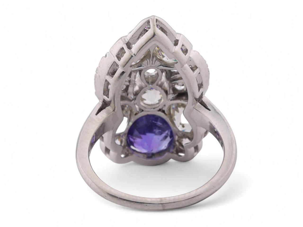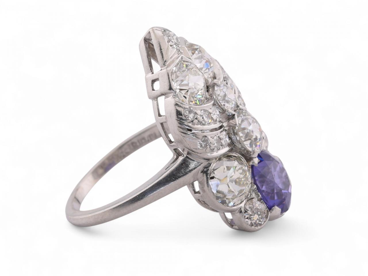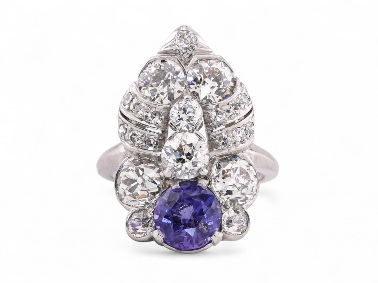 An impressive sapphire and diamond dress ring. The centre set with a round-cut sapphire weighing approximately 1.73 carats, of rich violet-blue colour. Surmounted by a bold arrangement of old European-cut diamonds. Total estimated diamond weight 2.63 carats, graded H/I colour, SI clarity. Mounted in platinum. Gross weight 8.86 grams. Finger size L.