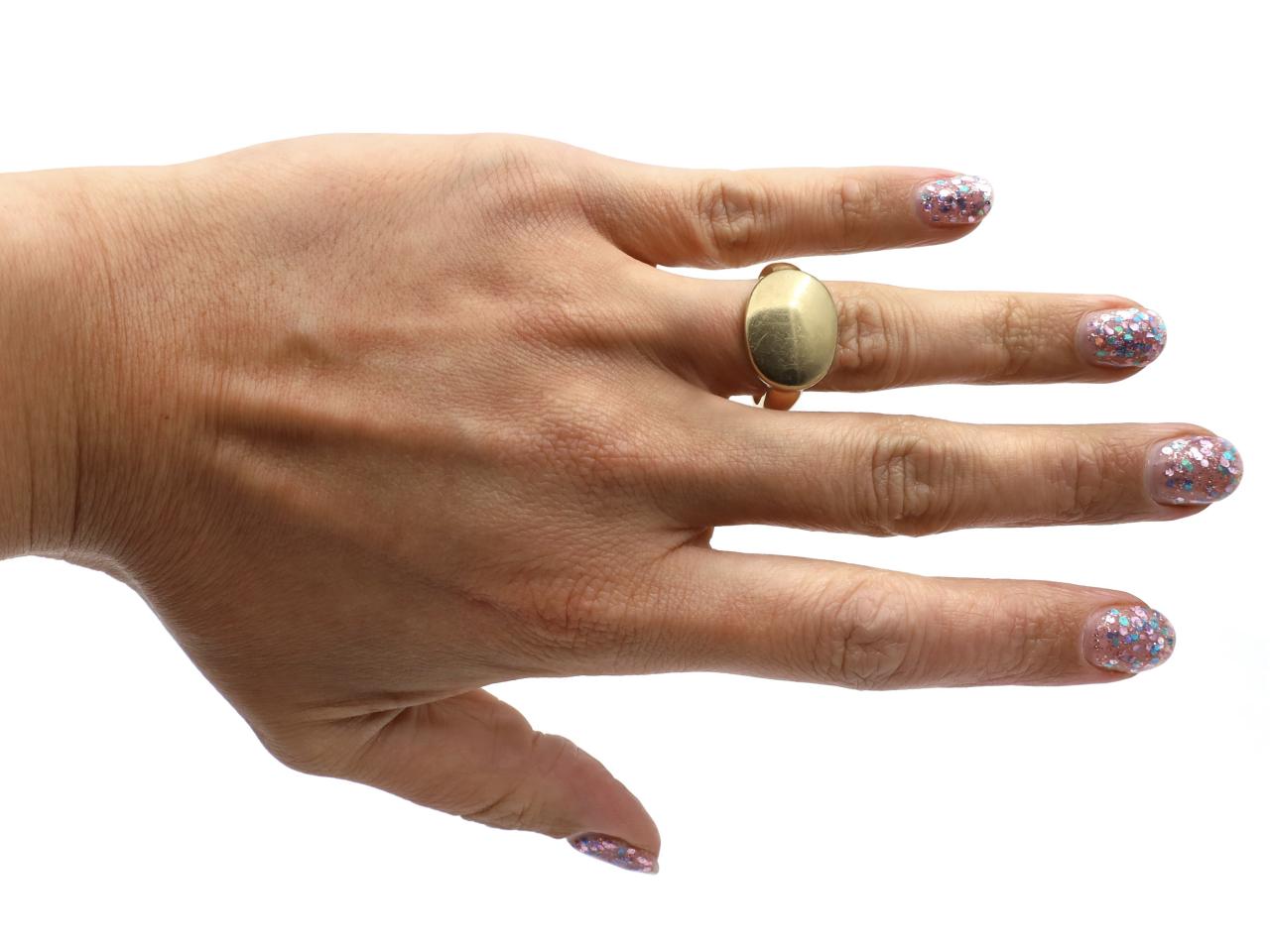 Screiber 18kt yellow gold oval plaque ring. Centred with an oval plaque fitted across the finger with rounded edges and met to either side with slightly trumpeting shoulders which taper to a solid shank. Hallmarked 18kt gold. Signed 'SCREIBER'.