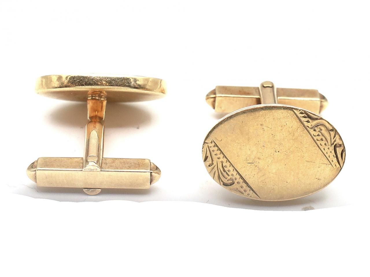 Solid 9kt gold oval and hinged T-bar cufflinks. Hallmarked 9kt gold.