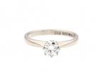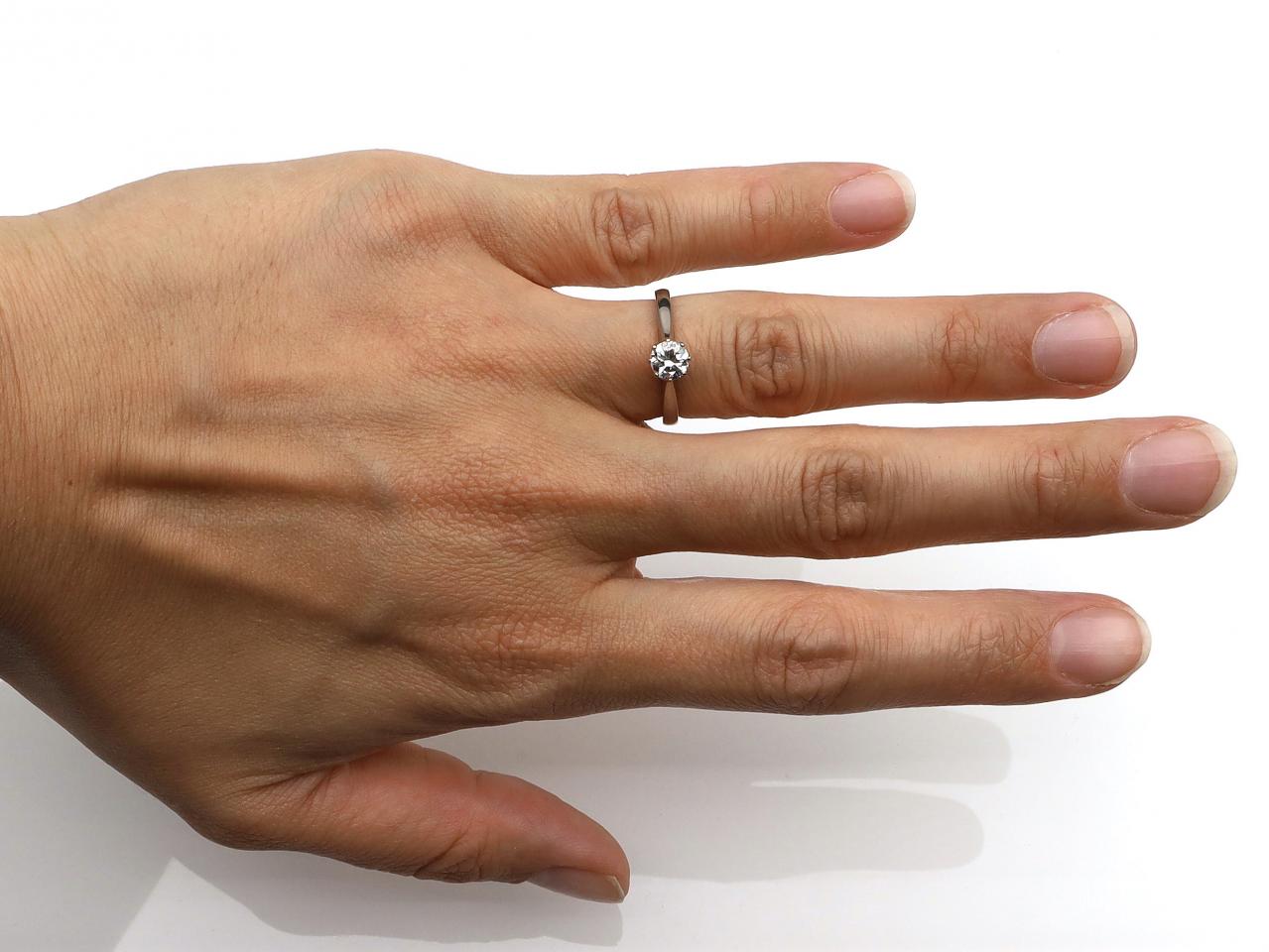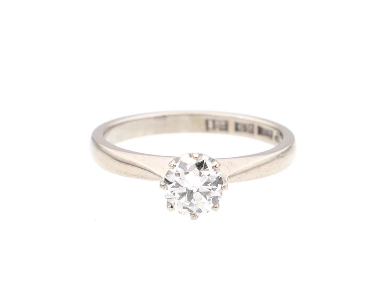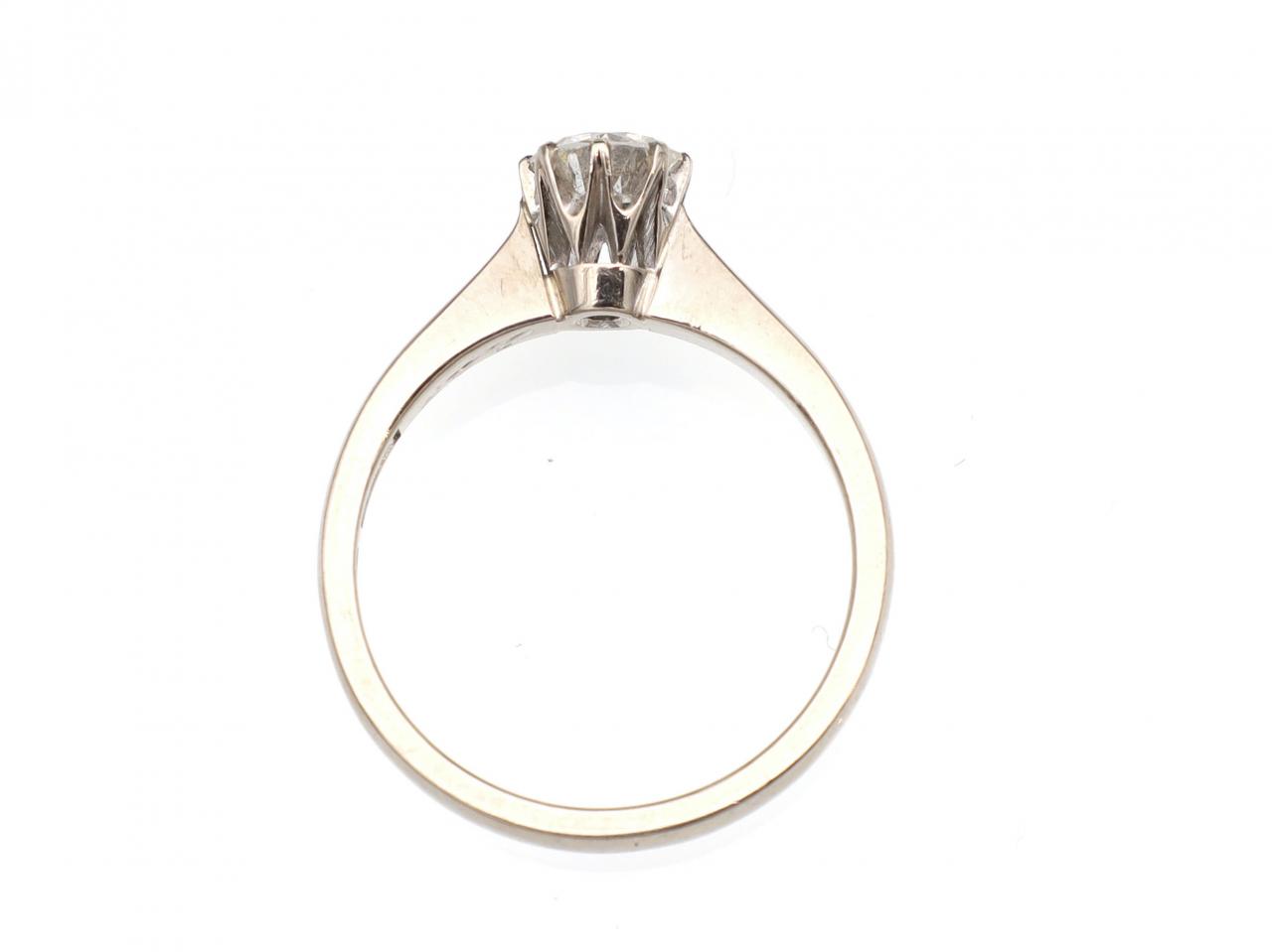 Swedish 18kt white gold diamond solitaire engagement ring. Set with a 0.47ct round Old European cut diamond, G-H colour, VS clarity in a claw setting, to a solitaire design with a pierced circular collet, curving claws and met to either side with inwardly tapering shoulders which curve to a slim shank. Marked 18kt gold.