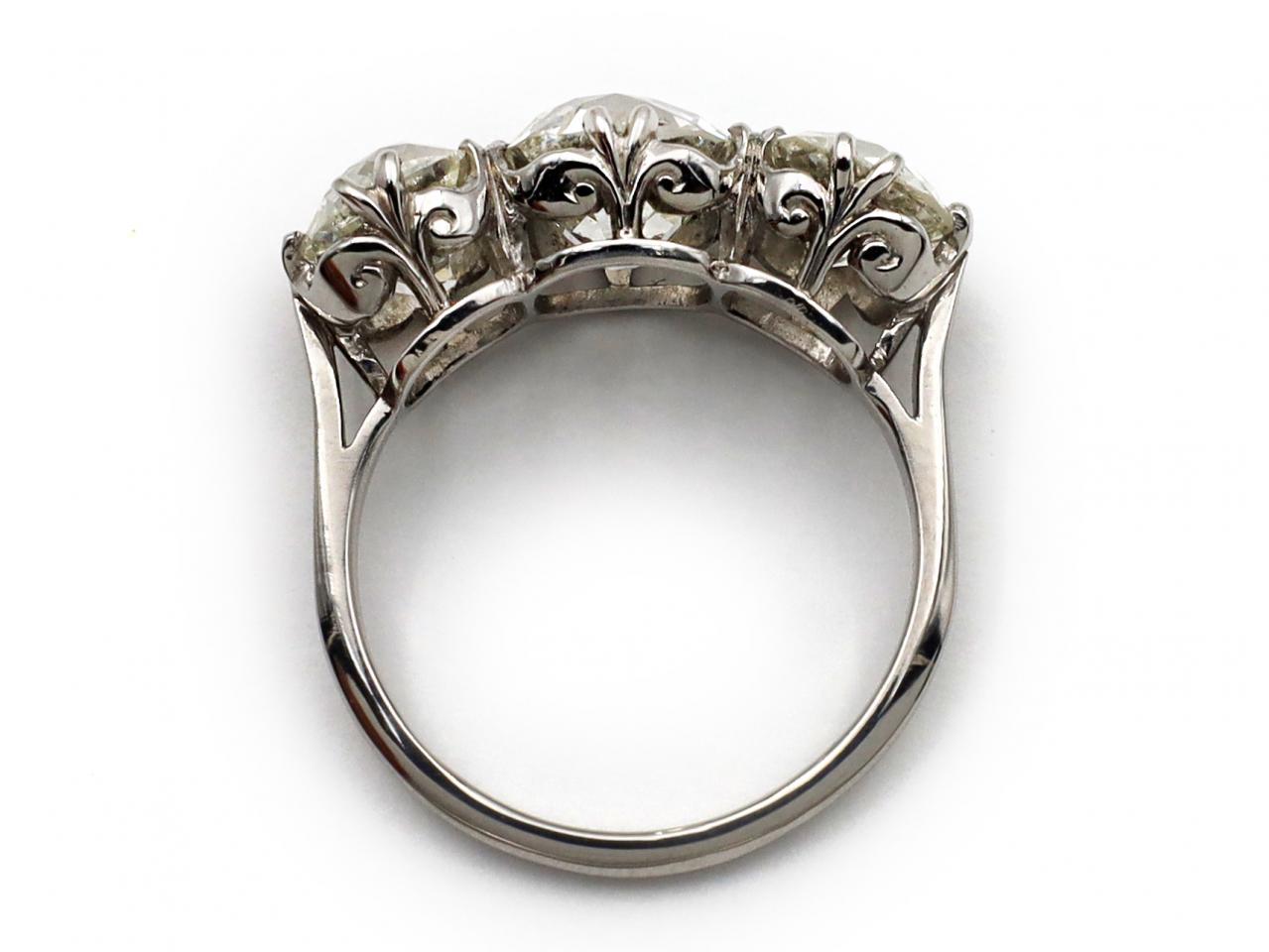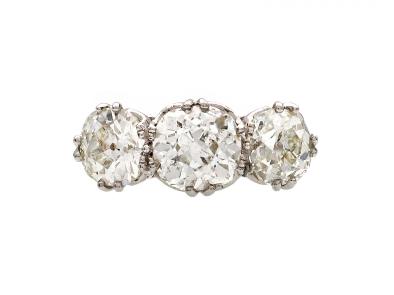 Three stone cushion shape Old Mine cut diamond ring in platinum.